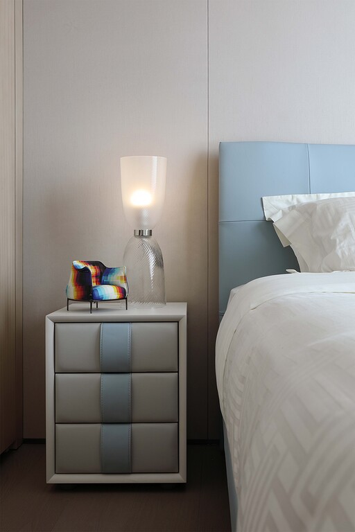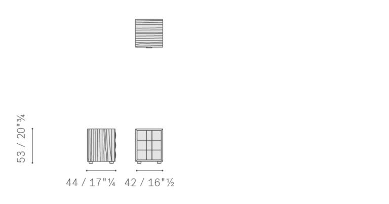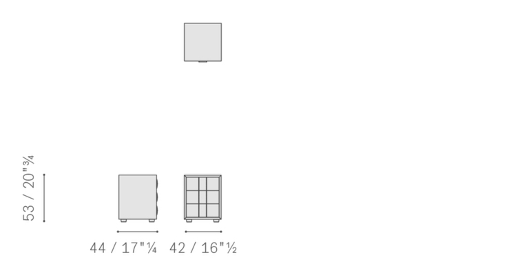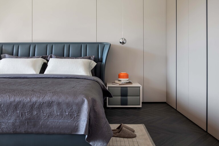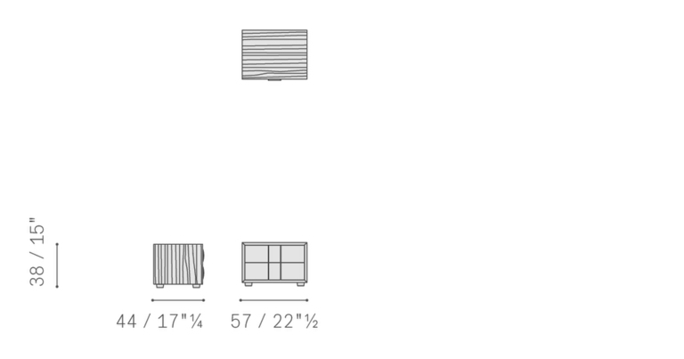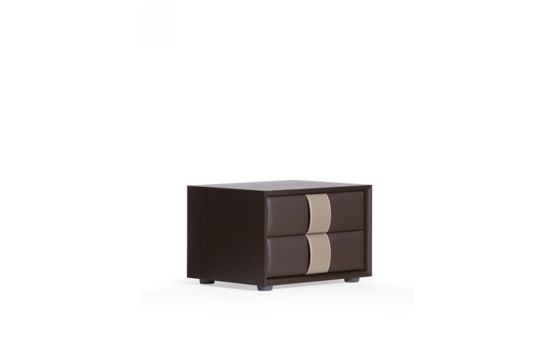 Фасады ящиков и ручки полностью обтянуты кожей Pelle Frau®, которая может быть выполнена в тон остальной обивки или в контрастном цвете. Эффектная вертикальная строчка — однотонная или контрастная — придает изделию утонченный декоративный акцент.