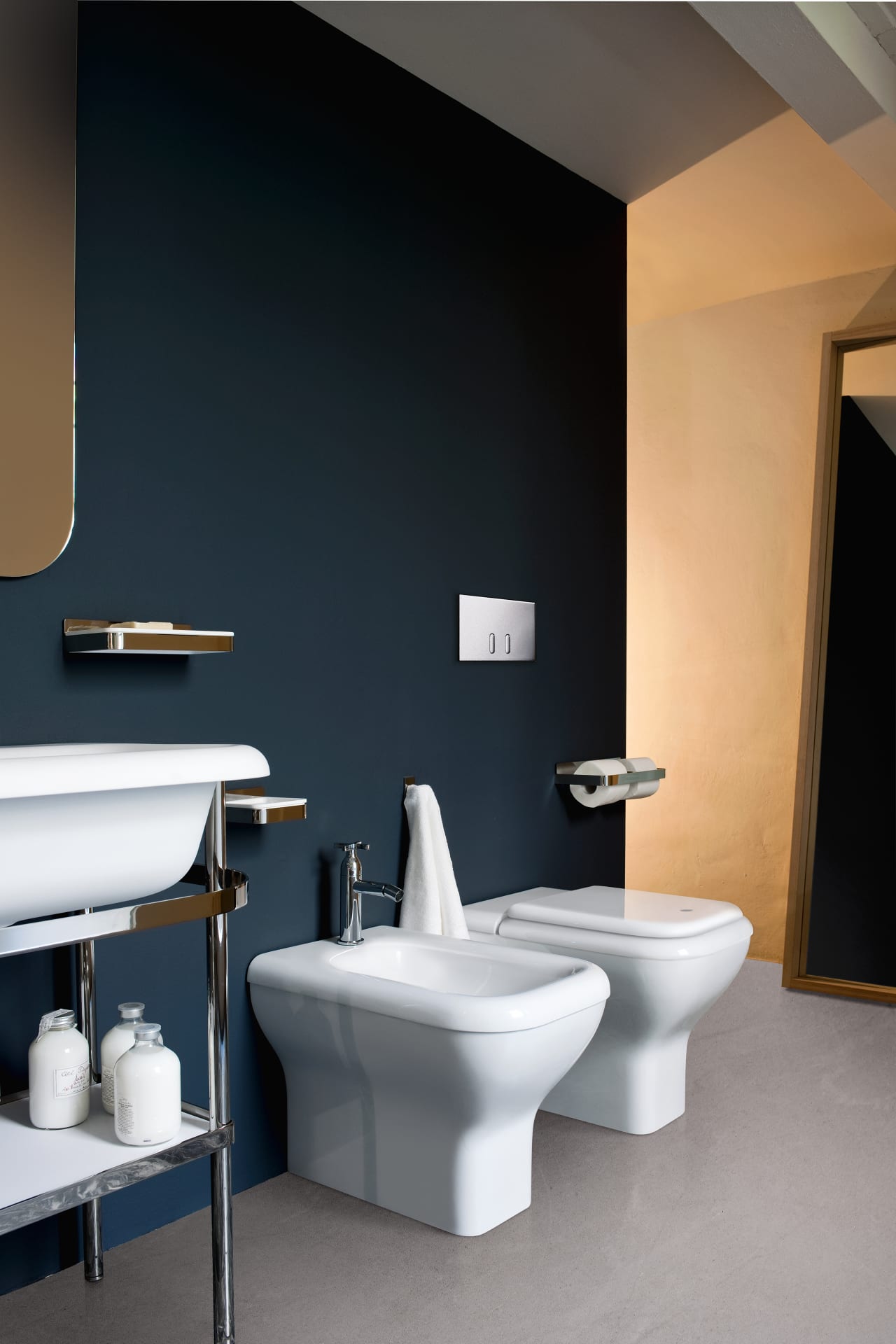 Сантехника из коллекции Memory представляет собой интерпретацию атмосферы традиционных ванных комнат, идеализируя изогнутые формы ушедших времен и создавая новое слияние прошлого и настоящего. Доступен в глянцевом или матовом белом или двухцветном керамическом светлом или темно-сером цвете снаружи, в отдельно стоящей версии.
