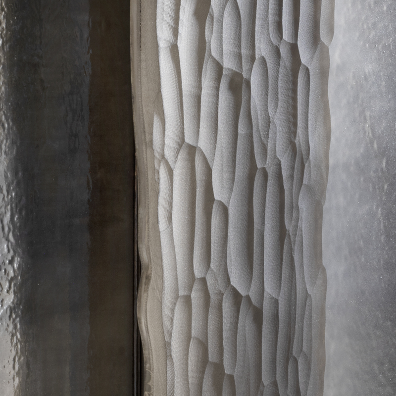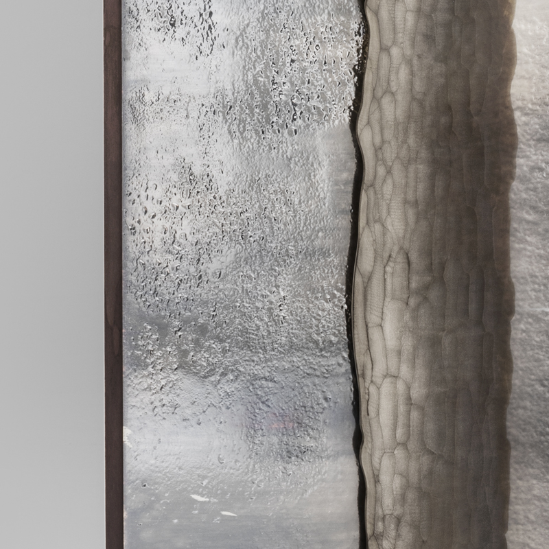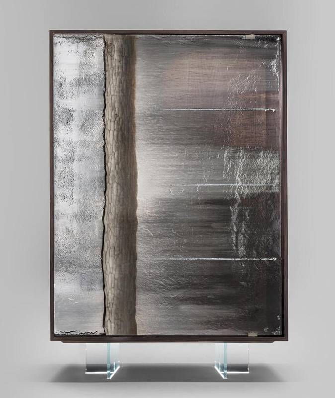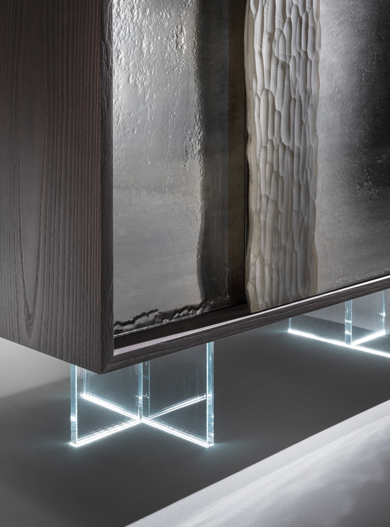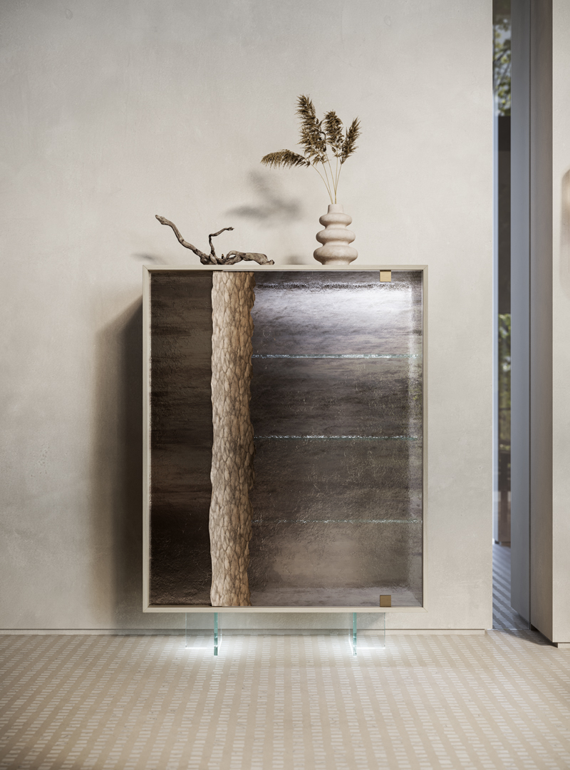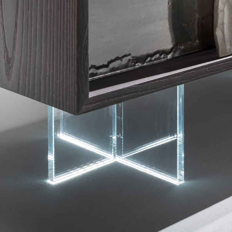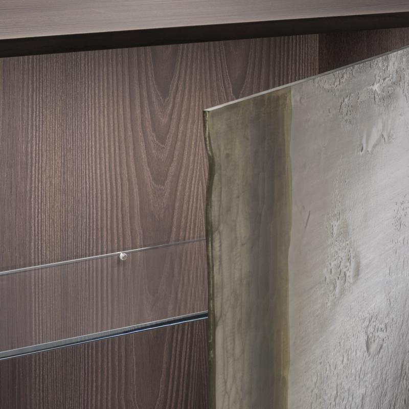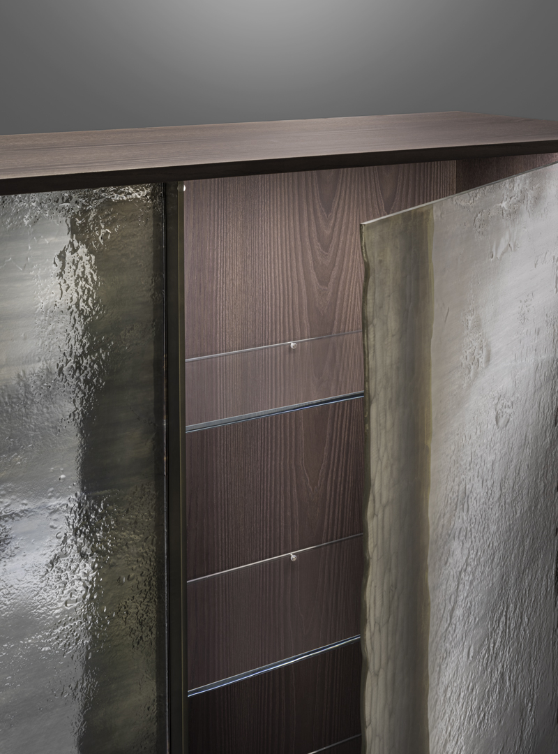 Корпус из ясеня в отделке Vendemmia. Одна дверца из закалённого стекла толщиной 8 мм с декором Barbaresco и Roddi; металлические петли с отделкой под шлифованную и полированную латунь. Внутренняя светодиодная подсветка. Полки и ножки — из сверх-прозрачного закалённого стекла.