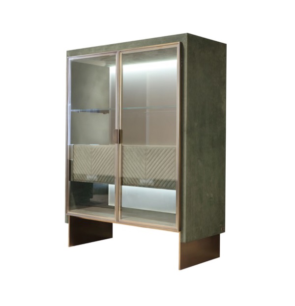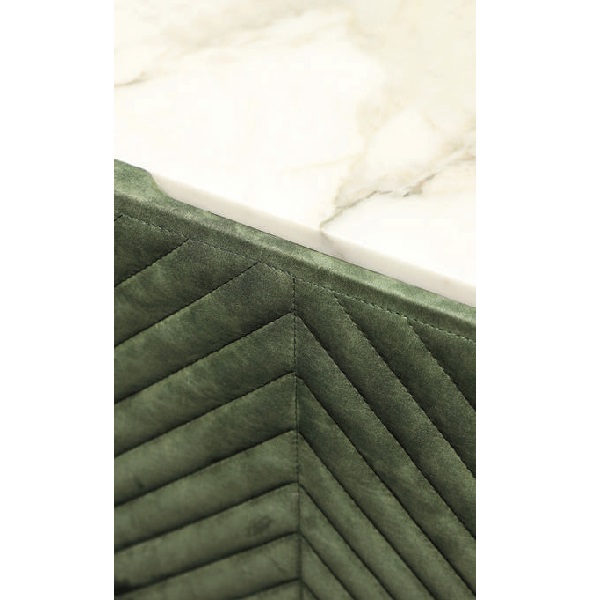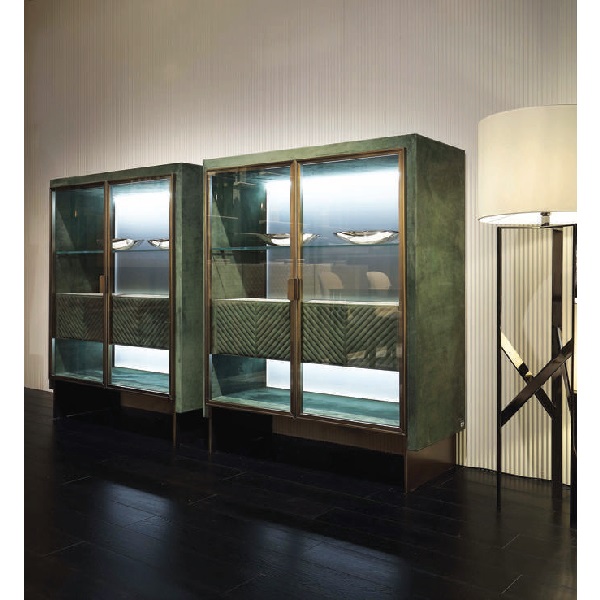 Кожа, металлические детали. Полка из мрамора. Фасад выдвижных ящиков отделан кожей с прострочкой.
