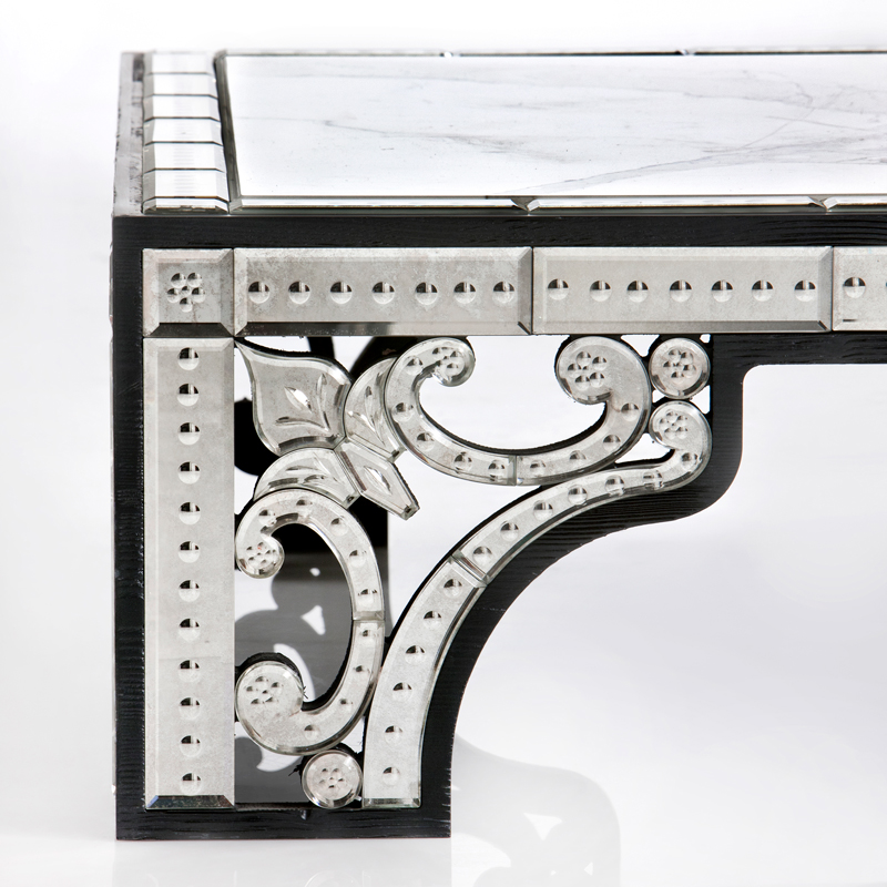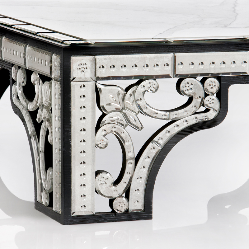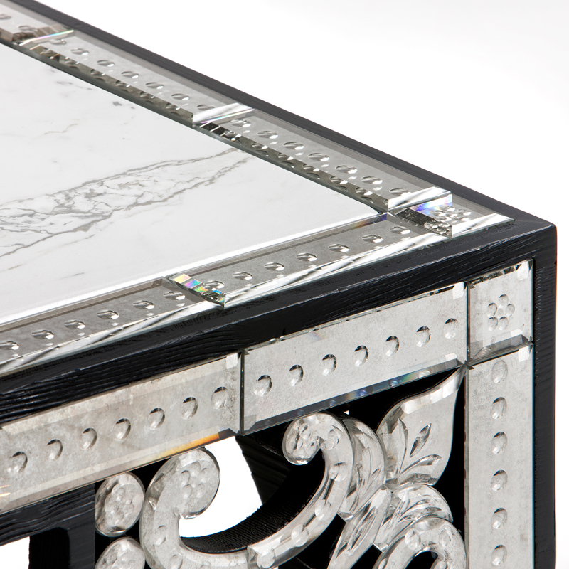 Резная конструкция из дерева с отделкой дымчато-серого цвета.Рамы и ножки из стекла с фацетом и гравировкой с зеркальной отделкой под старину.Скошенная столешница из мрамора Калакатта с золотистыми прожилками.