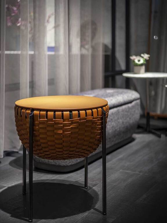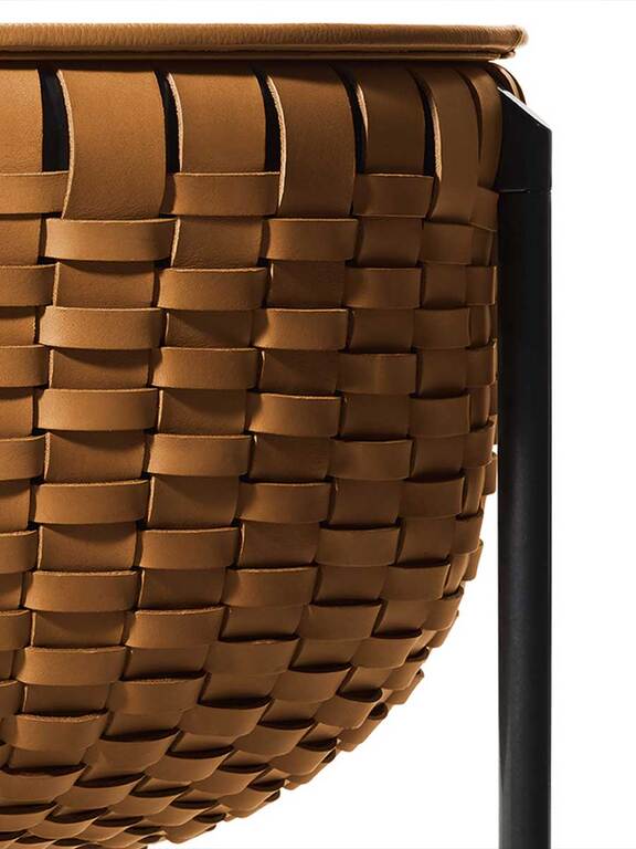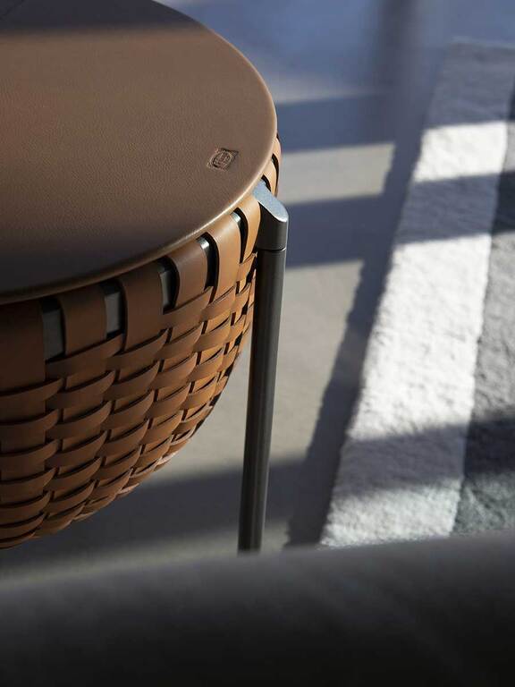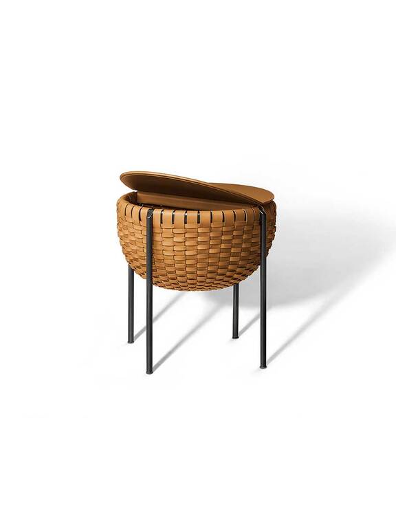 Cestlavie — это одновременно элегантная корзина для хранения и функциональный журнальный столик. Верхняя часть, обтянутая кожей Pelle Frau®, выполнена в виде складной крышки-диска, которая обеспечивает доступ к внутреннему пространству и служит удобной поверхностью.
