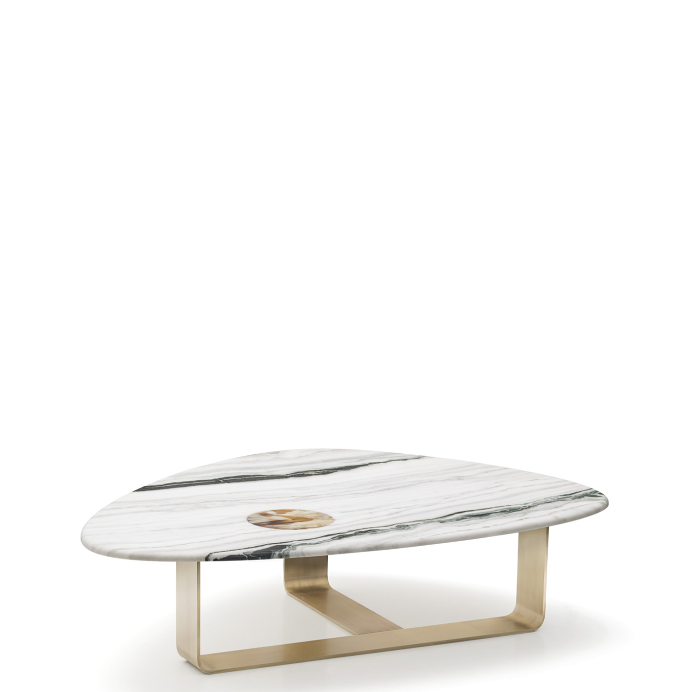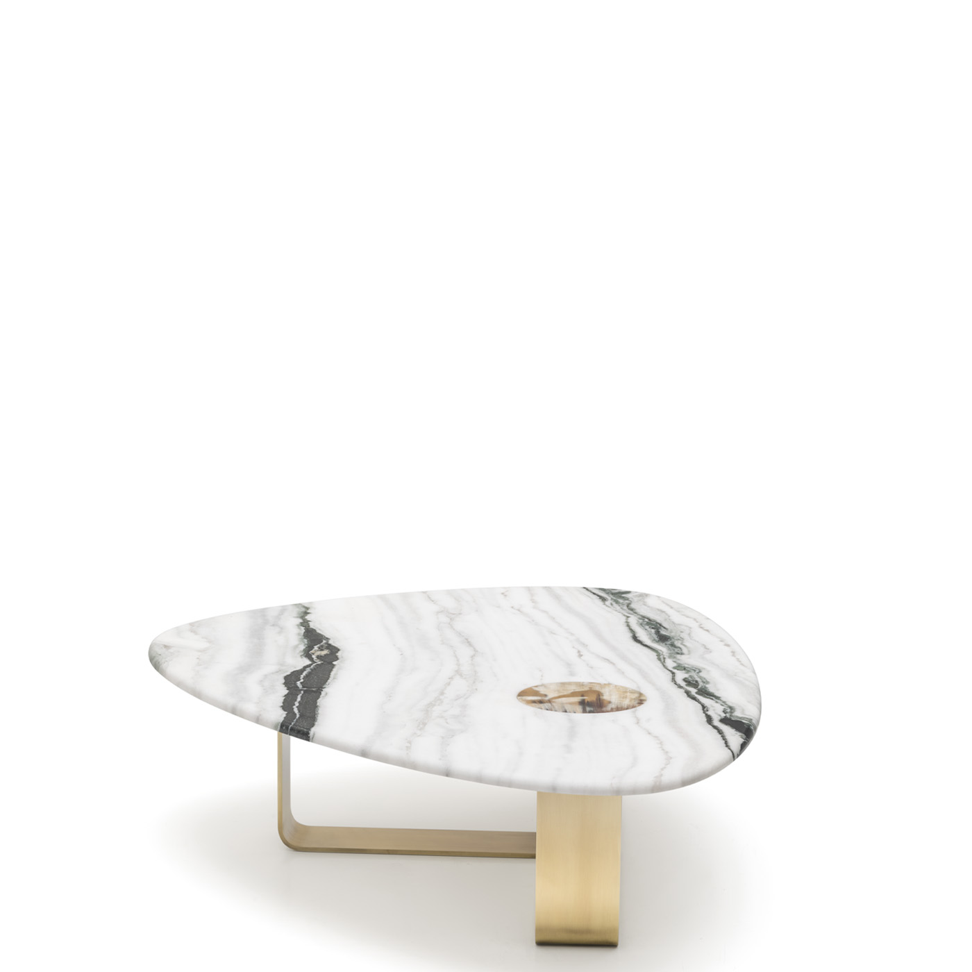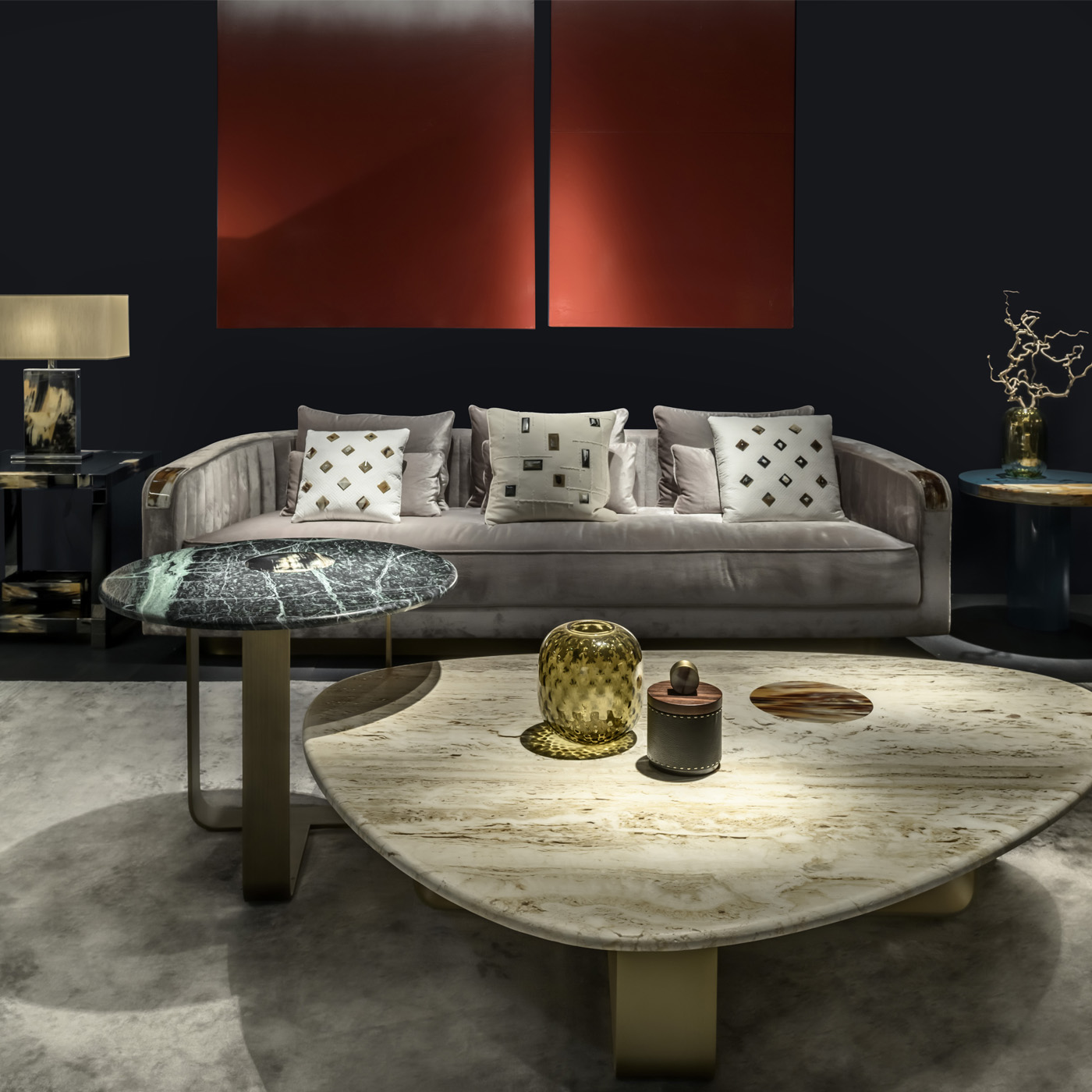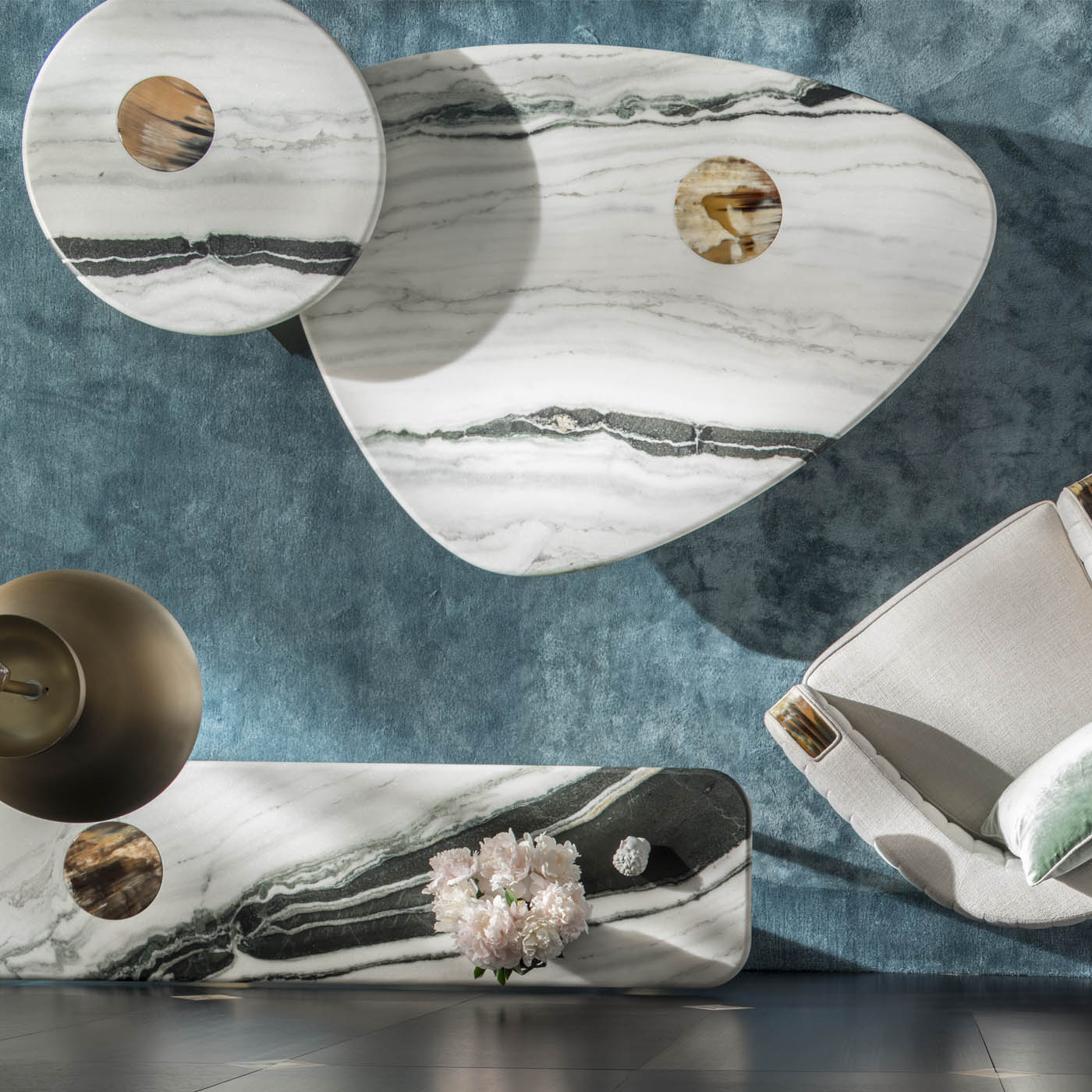 Художественное вдохновение и мастерство находят своё высшее воплощение в журнальном столике Demetra — эффектном союзе благородных материалов и безупречных форм. Изящное основание из сатинированного металла поддерживает утончённую столешницу из мрамора Dalmata с сатинированной отделкой, украшенную изысканной инкрустацией из глянцевого рога. Роскошные природные прожилки мрамора переплетаются, создавая гармоничные цветовые сочетания, способные подчеркнуть элегантность любого интерьера.