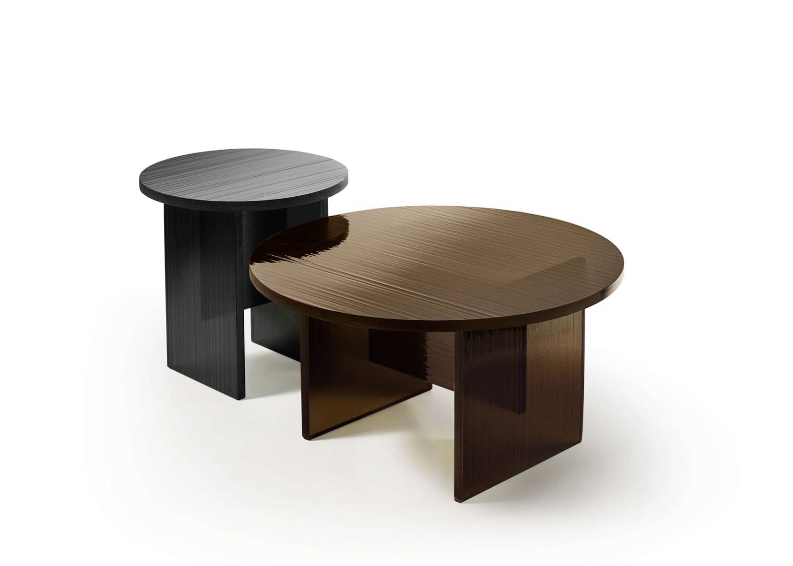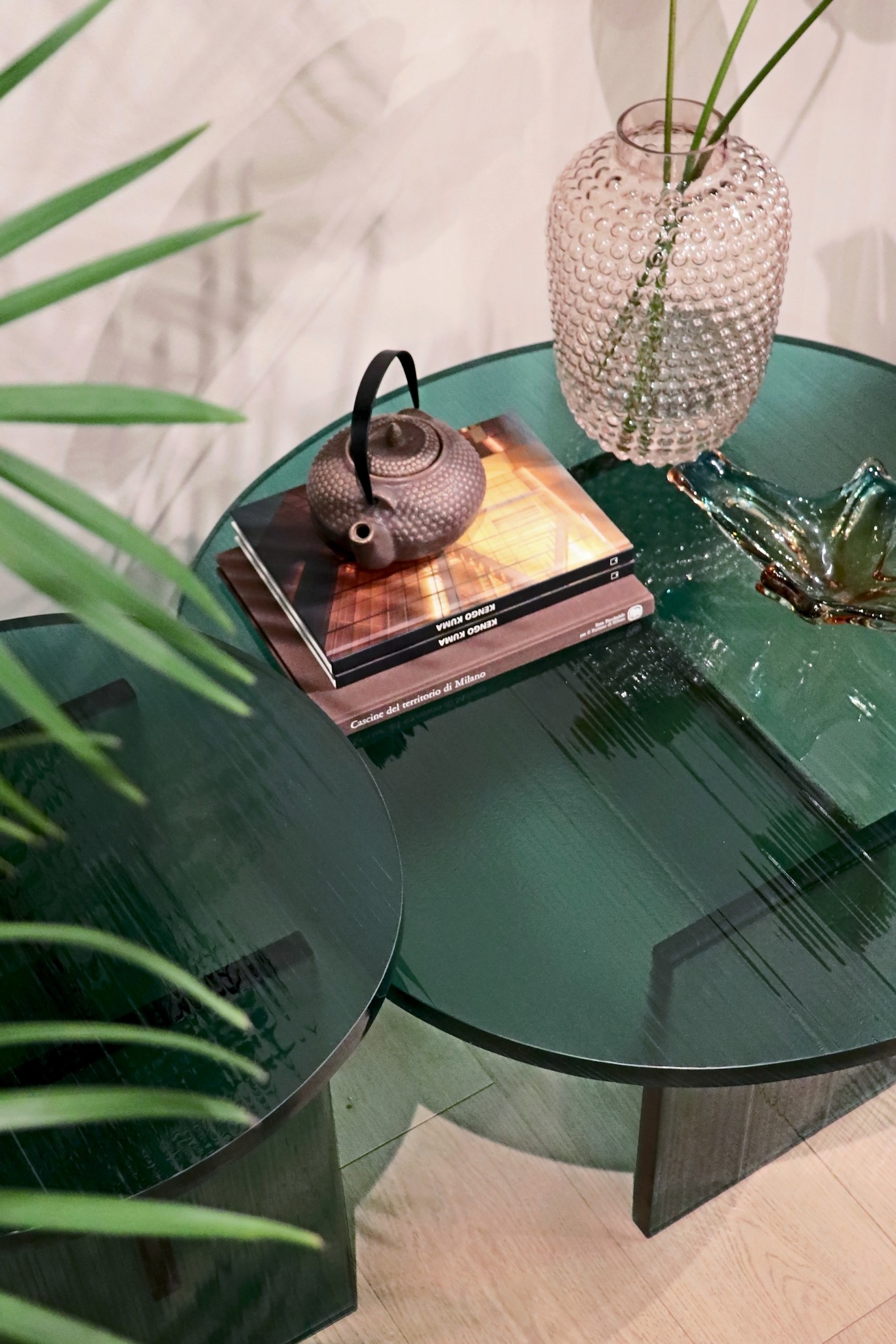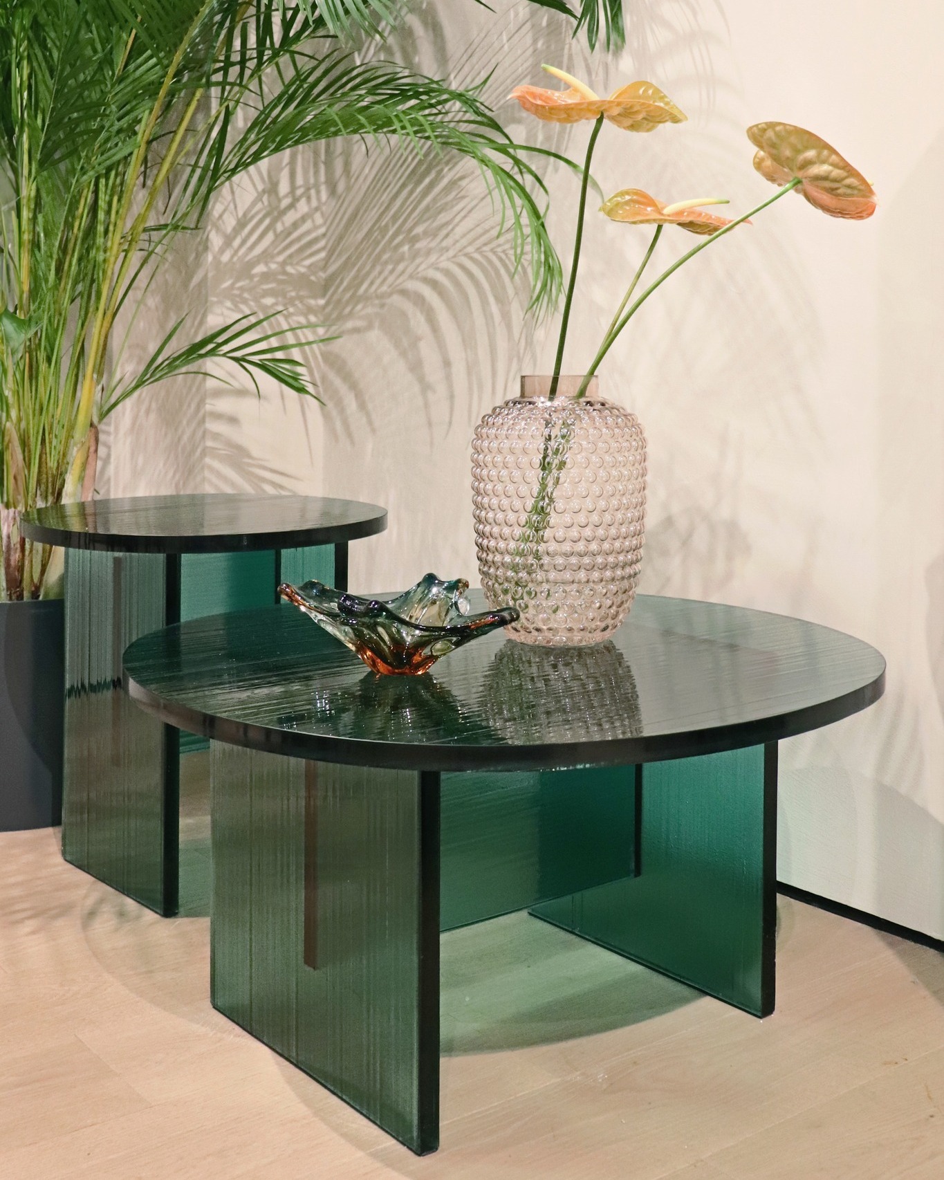 Столик целиком выполнен из массива стекла DV-Glass толщиной 23 мм, что придает ему скульптурную выразительность. Полуполированная кромка мягко преломляет свет, подчеркивая глубину цвета. Выберите оттенок под свой интерьер: благородный бронзовый, загадочный дымчатый или насыщенный зеленый.