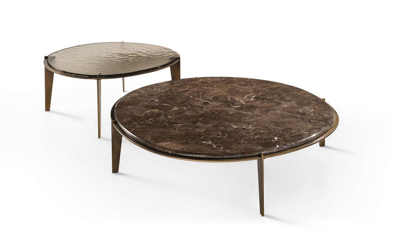 Журнальный столик Halo с мраморной столешницей из серого мрамора Grigio Carnico и металлической структурой, крашенной в цвет ottone brunito.
