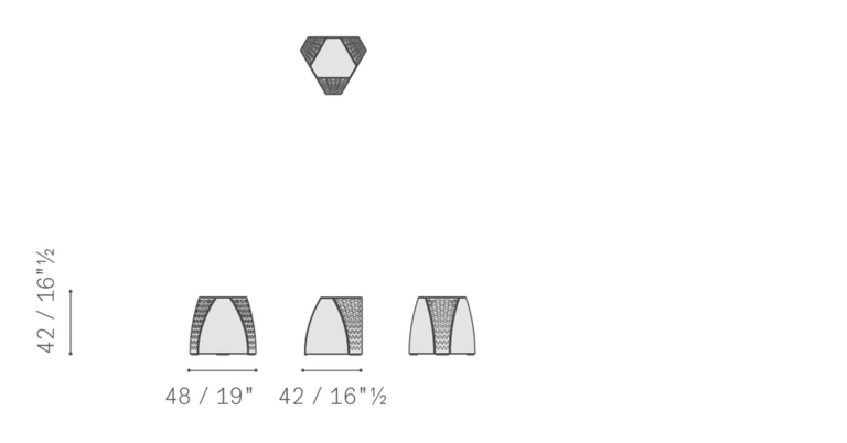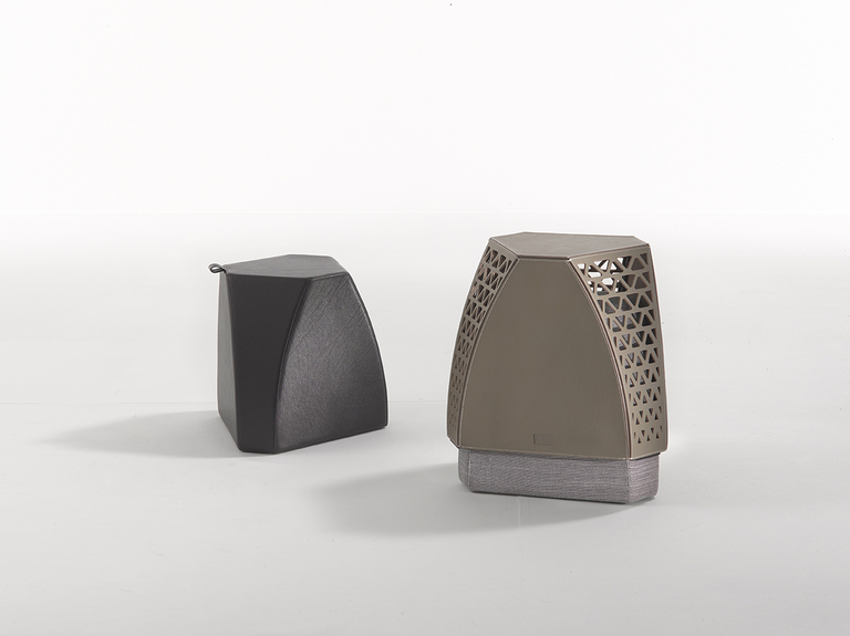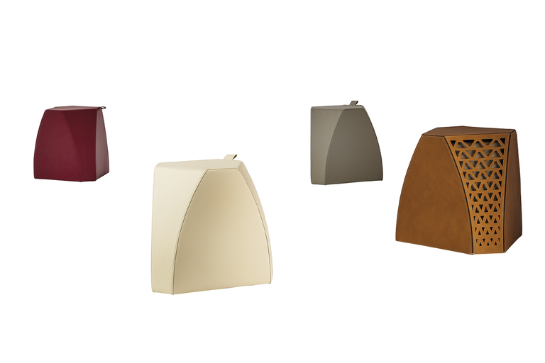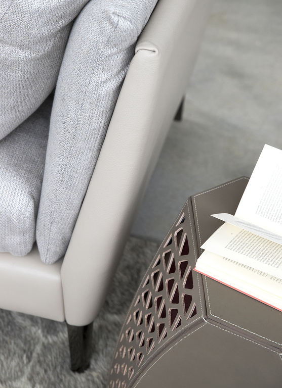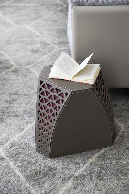 Обивка столика выполнена из кожи Saddle с обработанными краями и контрастной строчкой. Три панели из гладкой натуральной кожи чередуются с тремя панелями, выполненными из перфорированной кожи с изысканным геометрическим узором.