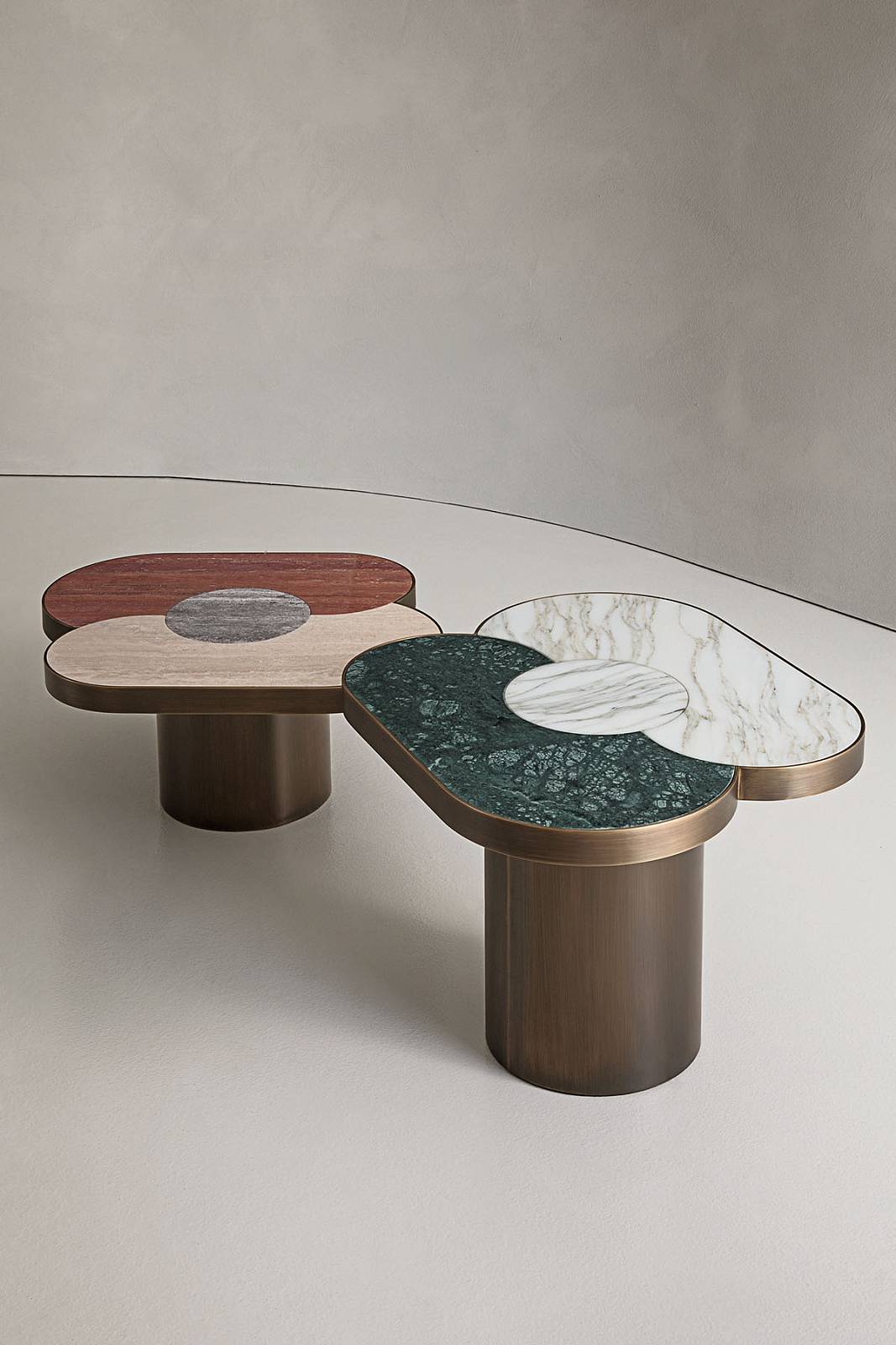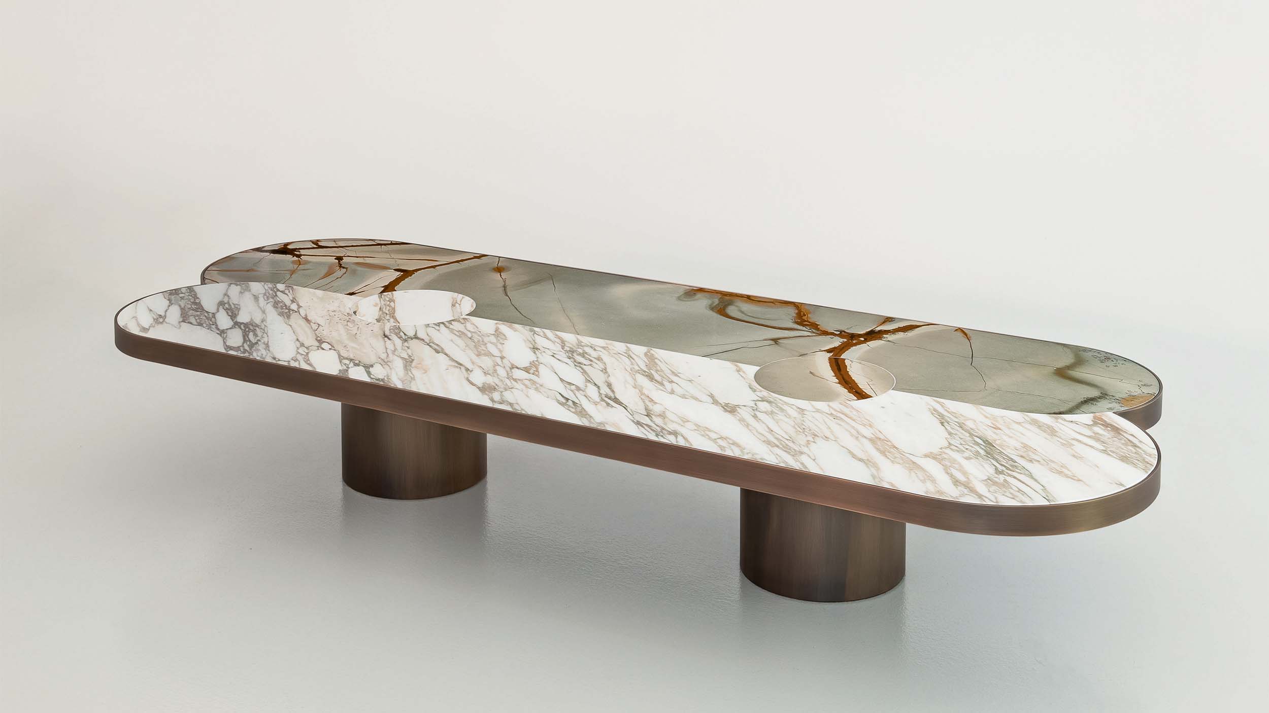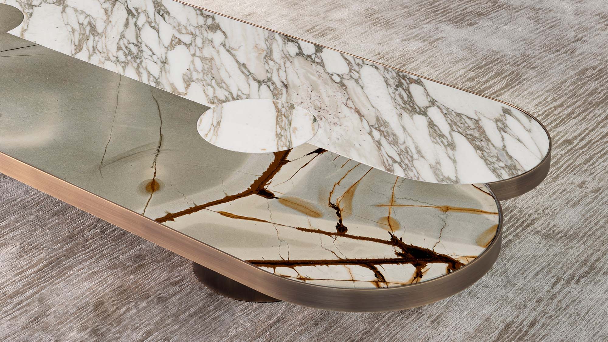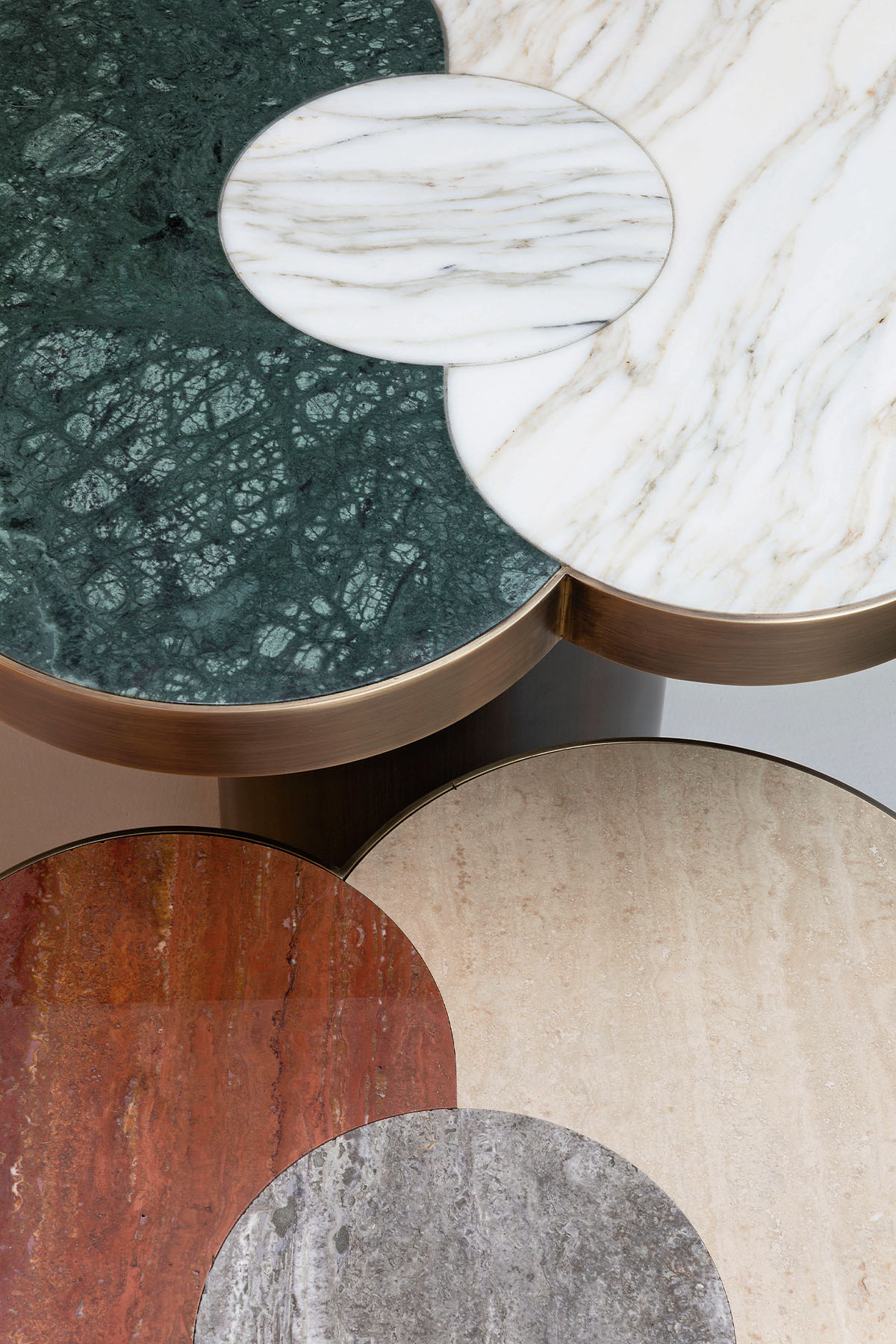 Основание из латуни бронзового цвета. Столешница из мрамора или сочетания двух сортов мрамора.