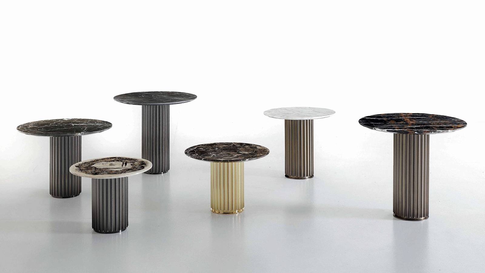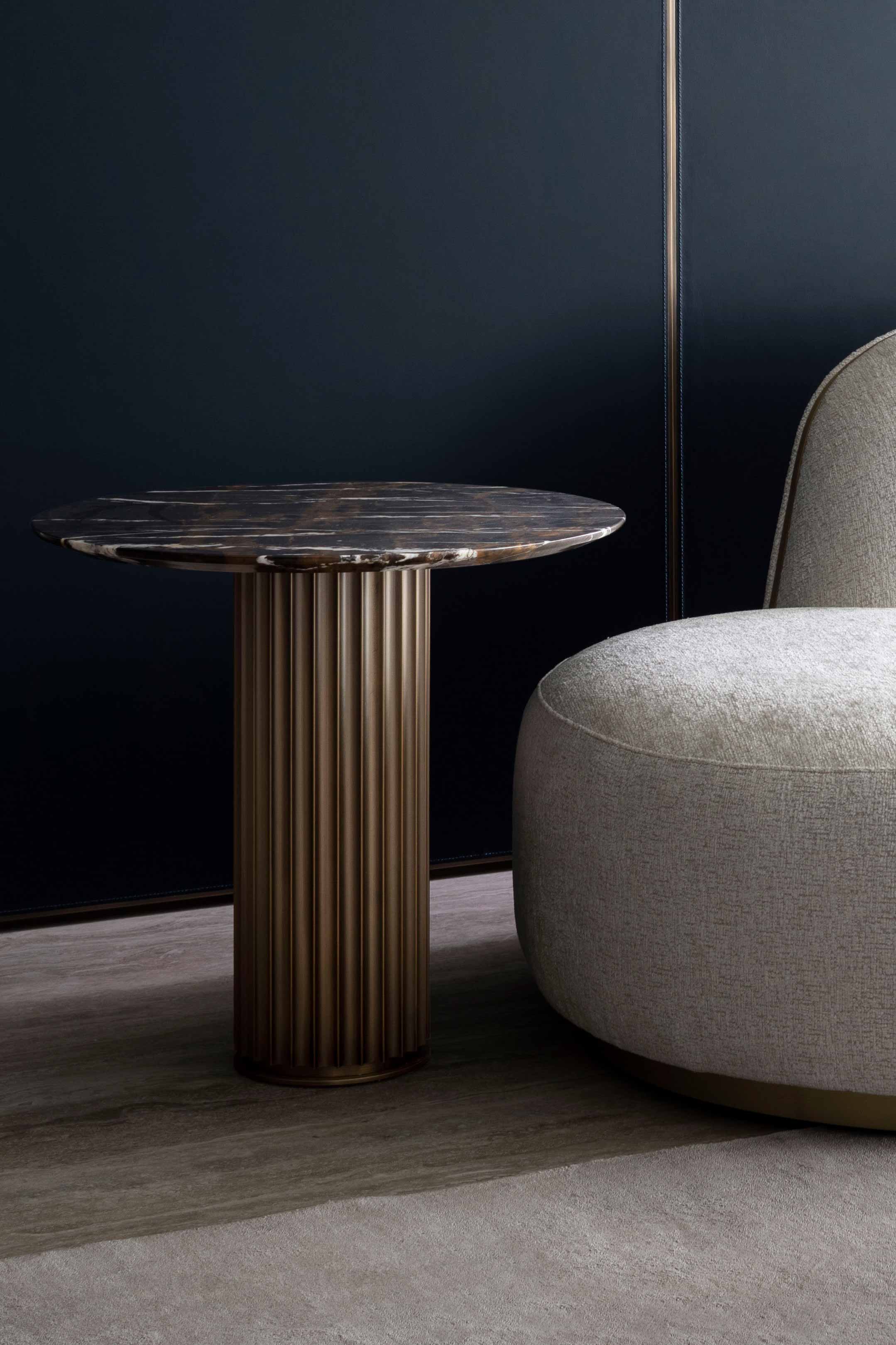 Металлическое основание бронзовая латунь, черный хром или золото. Столешница может быть выполнена в коже, мраморе, дереве Ebony или декорирована художественной росписью Decoro.