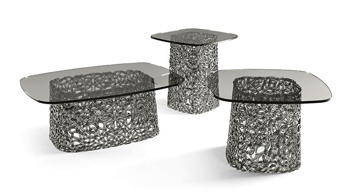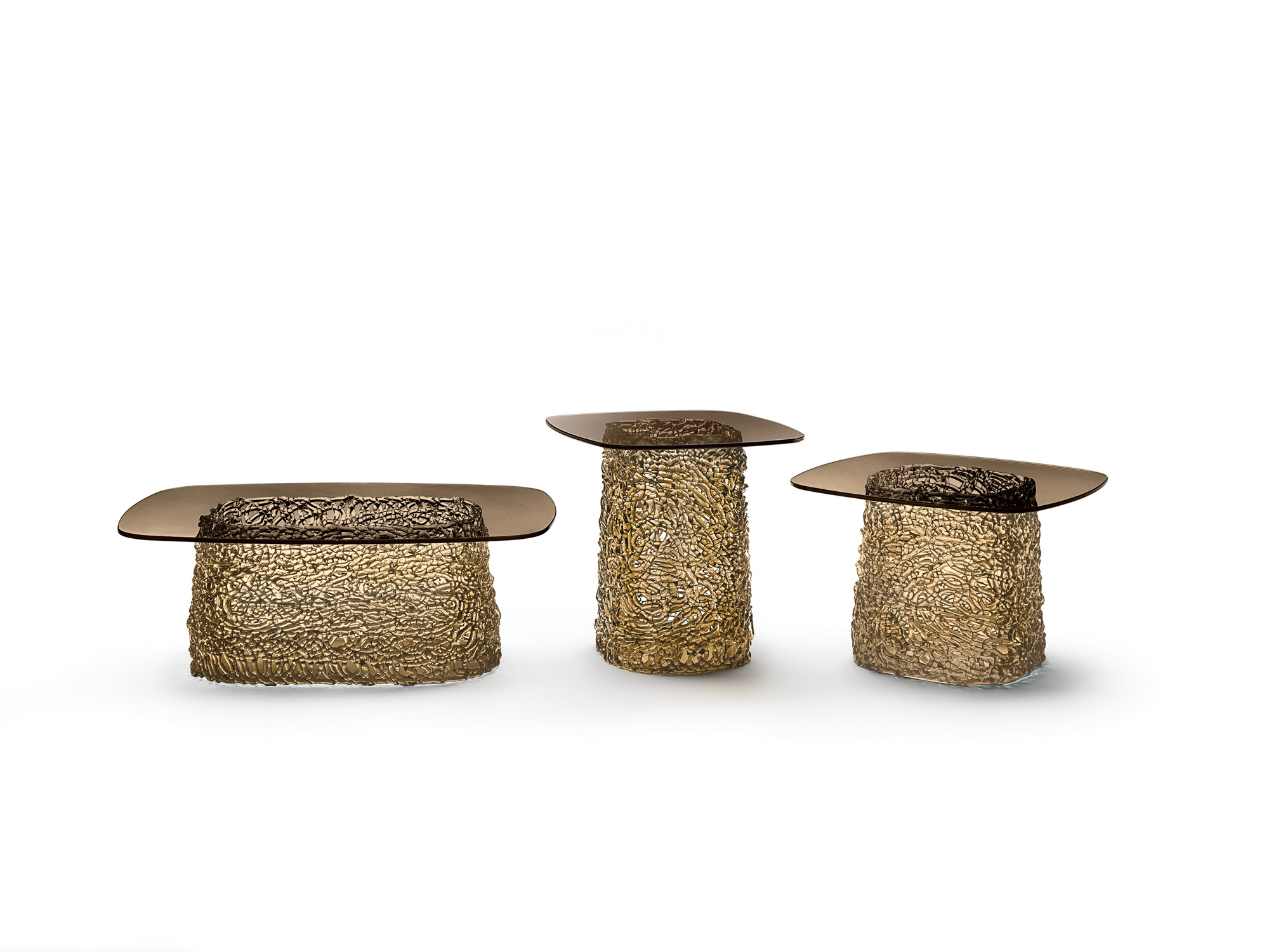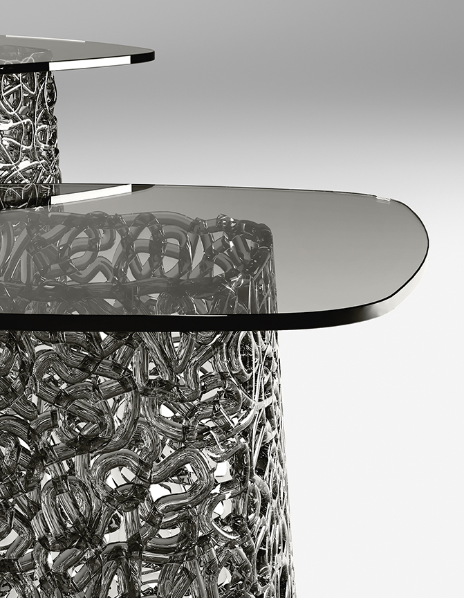 Ажурное основание, сплетенное вручную из стеклянных нитей, словно парит в воздухе, поддерживая строгую столешницу из 10-миллиметрового стекла. Игра фактур создает ощущение невесомости.