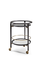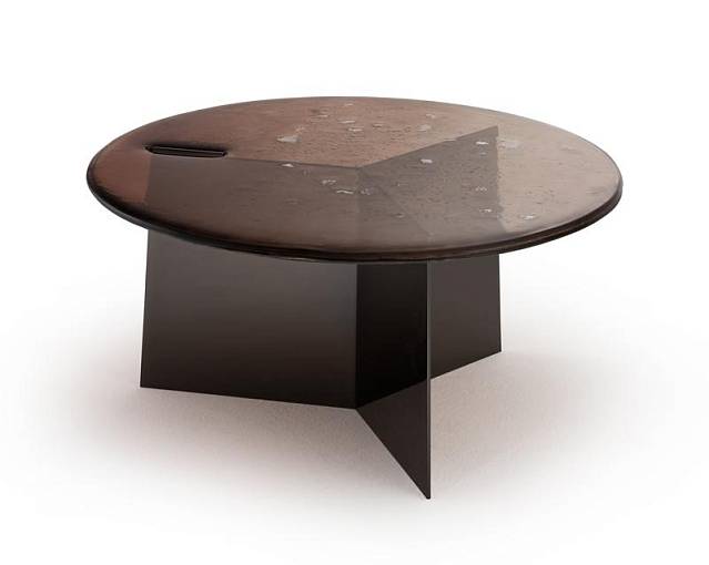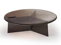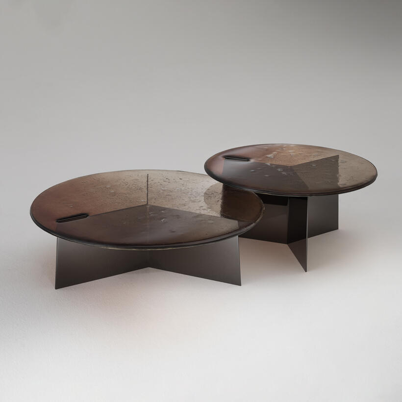 Столешница с неровными краями выполнена по уникальной технологии из двух слоев стекла, запеченных вместе, что создаёт выразительную фактуру. Ее поверхность покрыта лаком, переходящим от насыщенного бронзового тона в прозрачный, с частичным серебрением сзади.Основание из листового железа с отделкой полированный никель.