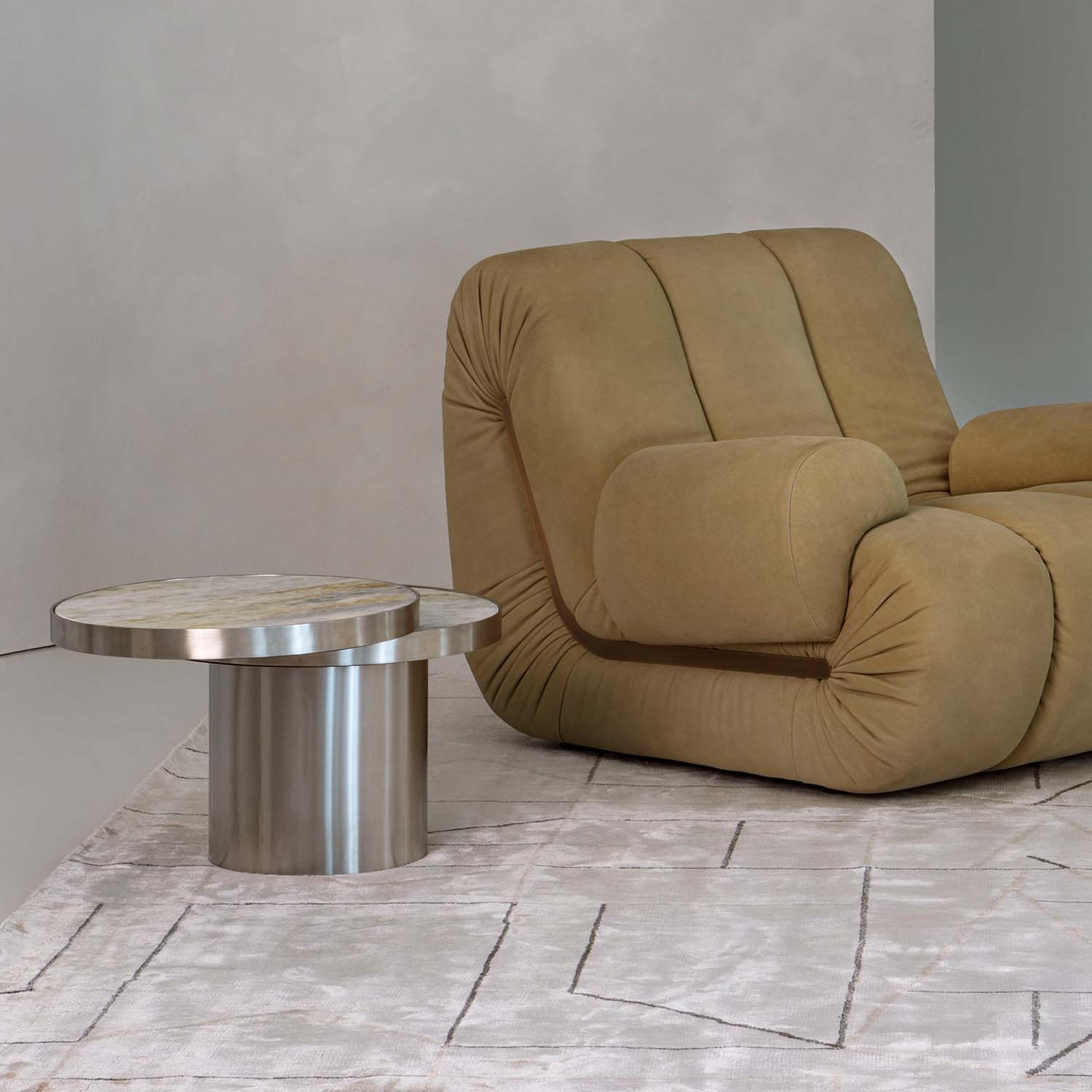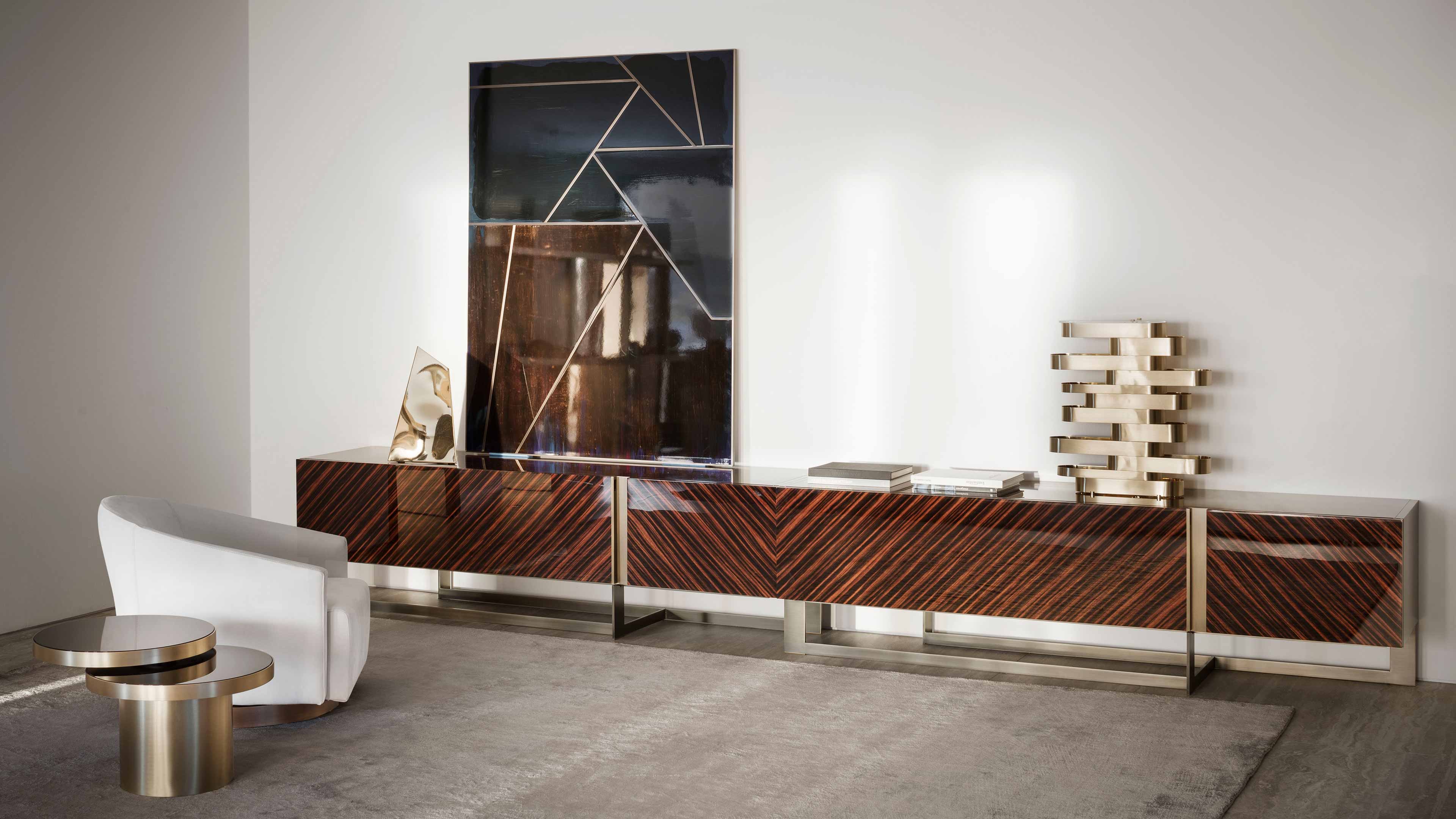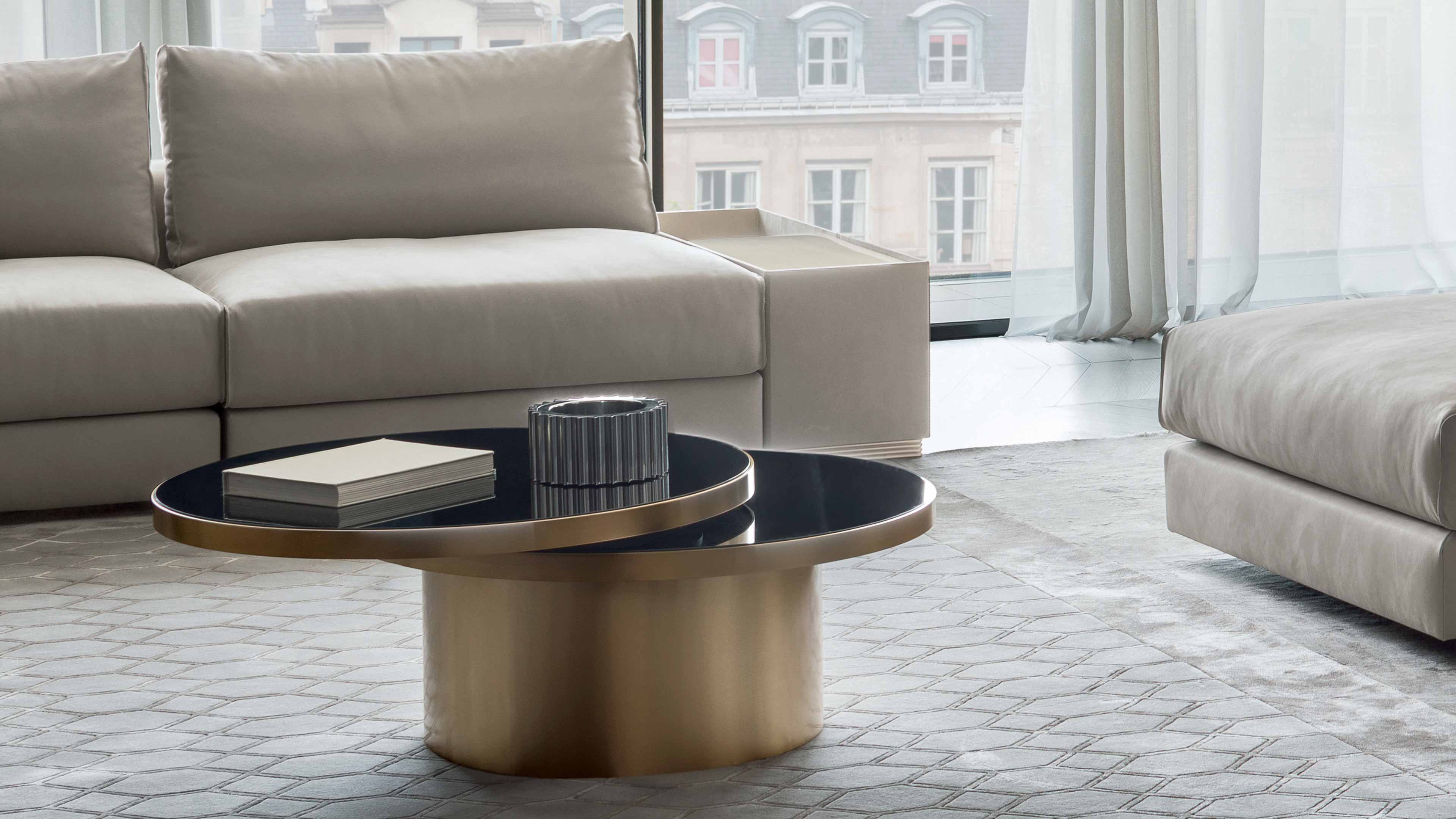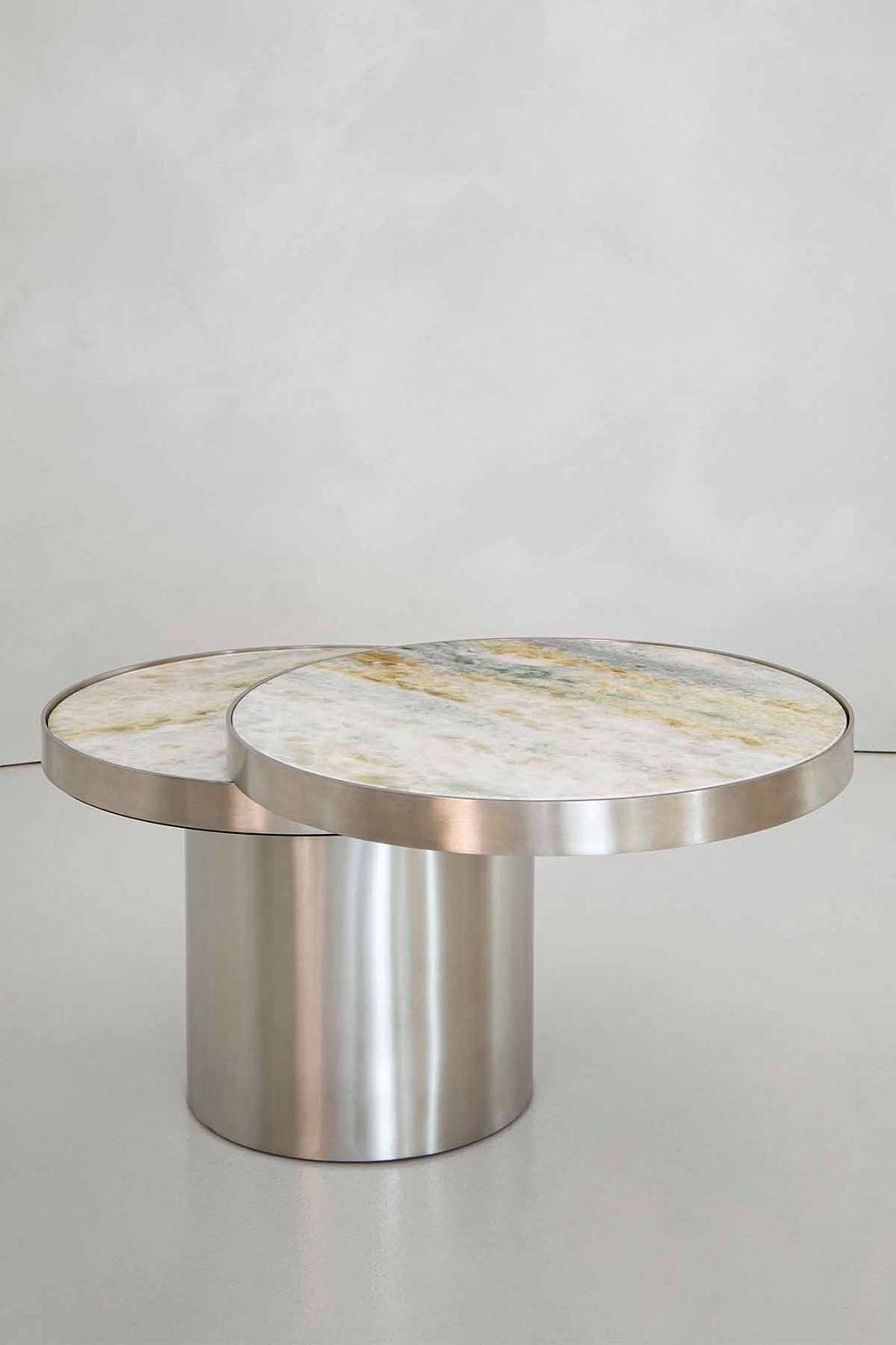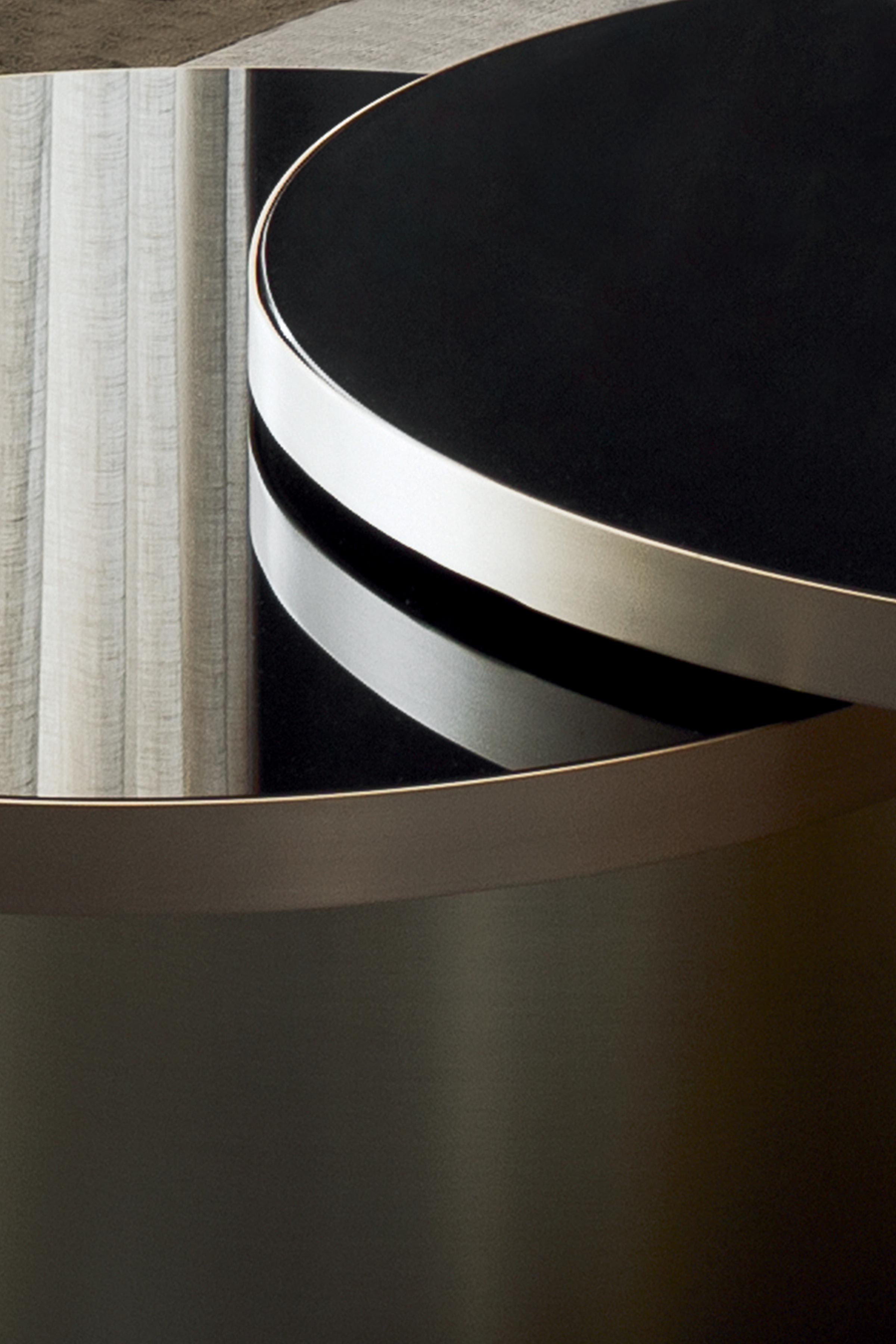 Основание и детали из брашированной латуни, латуни бронзового цвета или брашированная сталь. Столешница из черного стекла или мрамора.