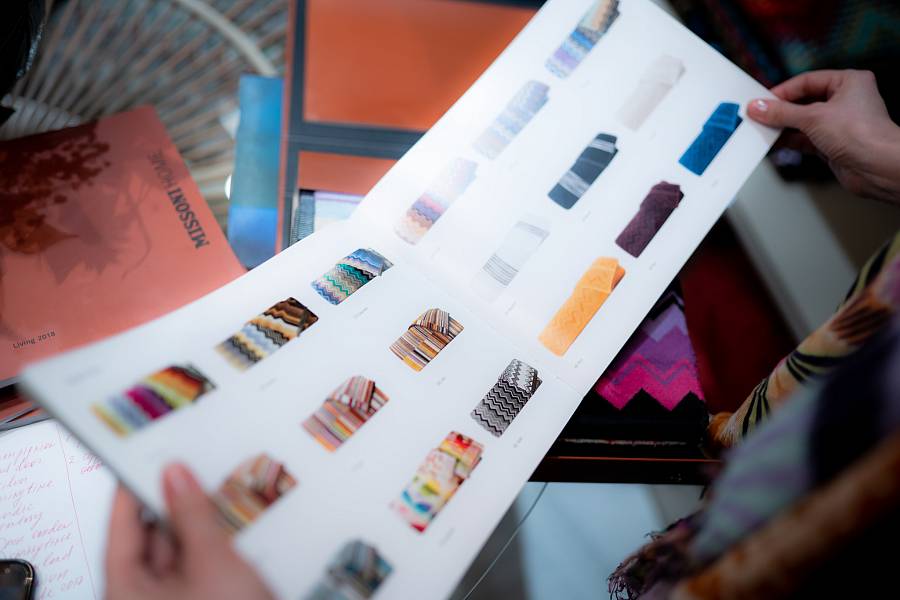 Ванда Ельмини – племянница Розиты Миссони (основательницы бренда Missoni) – создает коллекции домашней линии Missoni home. Ванда рассказала, что MissoniHome – это не просто готовый продукт, который обладает заданными характеристиками. Это, в первую очередь, особая философия, которая определяет стиль жизни. MissoniHome - это любовь к жизни, открытость экспериментам, готовность воспринимать новое и яркое, готовность играть с цветом, текстурами, ощущениями. Именно через призму этой философии каждый год создается новая коллекция бренда MissoniHome. Орнаменты и модные цвета коллекции одежды Missoni 2018 года «переносятся» на домашний текстиль MissoniHome, изменяясь в размерах, оттенках и формах. Восприятие одного и того же орнамента меняется в зависимости от текстуры, поэтому, желая добиться определенного эффекта, Ванда играет с текстурами: деликатно добавляет золотую нить для ощущения роскоши, шелк – для глянцевого отлива, шерсть – для уюта.