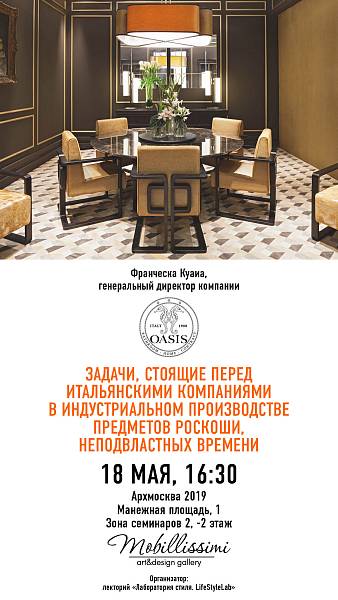 18 мая 2019 года в рамках 24 Международной выставки архитектуры и дизайна "АрхМосква 2019" при поддержке Art&Design gallery Mobillissimi состоится лекция Франчески Куаиа - генерального директора и представителя четвертого поколения владельцев всемирно известного бренда OASIS.