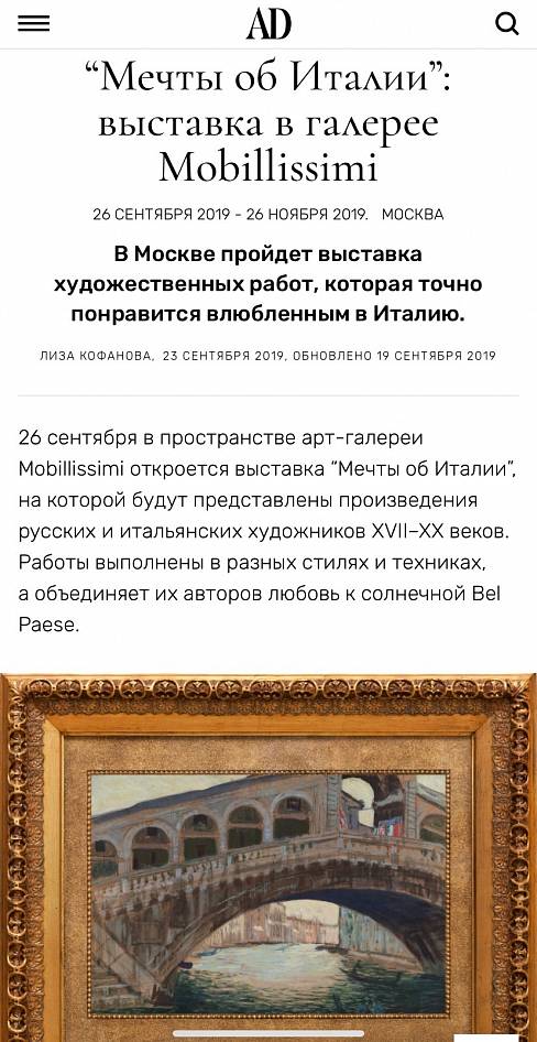 AD Magazine.ru / "Мечты об Италии": выставка в галерее Mobillissimi