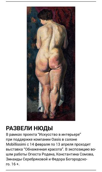 В рамках проекта "Искусство в интерьере" при поддержке компании OASIS в салоне Mobillissimi с 14 февраля по 13 апреля проходит выставка "Обнаженная красота". В экспозицию вошли работы Огюста Родена, Константина Сомова, Зинаиды Серебряковой и Федора Богородского.