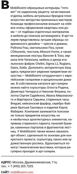В Mobillissimi образцовые интерьеры "готовят" по надежному рецепту: качественная отделка, мебель актуальных брендов плюс искусство авторства признанных мастеров...