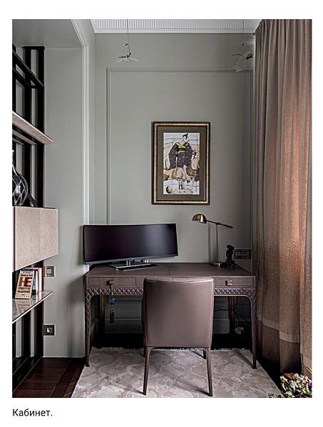 В хозяйской спальне от Poltrona Frau и в кабинете рядом с рабочей зоной от фабрики Rugiano и приютилась замечательная работа Елизаветы Надеждиной. Очень живо дополняют интерьер светильники замечательный итальянской фабрики SigmaL 2 и керамика русских художников Оксаны Панфиловой и Анны Антадзе-Мамаладзе.