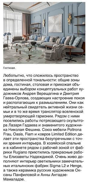 Любопытно как сложилось пространство в определённой тональности и настроении – так общие зоны дома – гостиная, столовая и прихожая- объединены выбором концептуальных работ художника Андрея Верещагина создающих настроение покоя и размышления - они как нейтральный свидетель для бурной жизни семьи и в то же время транслятор вселенской умиротворяющей гармонии. Рядом с ними поселились работы потрясающего скульптора Лазаря Гадаева и знаменитого художника Николая Фешина. Союз мебели Poltrona Frau, Oasis, Fiam, ковров Limited Edition и светильников Sigma L2 делает эти пространства безупречными с точки зрения интерьера.