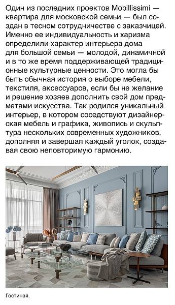 Один из последних проектов Mobillissimi - квартира для московской семьи, был создан в тесном сотрудничестве с заказчицей. Именно ее индивидуальность и харизма определили характер интерьера – дома для большой семьи, молодой, динамичной и в то же время связанной с традиционными культурными ценностями.