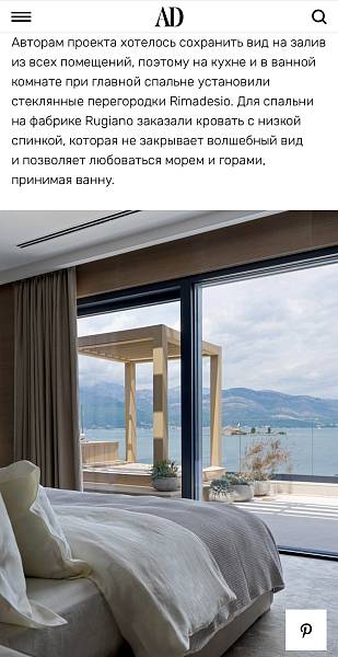 Авторам проекта хотелось сохранить вид на залив из всех помещений, поэтому на кухне и в ванной комнате при главной спальне установили стеклянные перегородки Rimadesio @rimadesio_official. Для спальни на фабрике Rugiano @rugiano_interiors заказали кровать с низкой спинкой, которая не закрывает волшебный вид и позволяет любоваться морем и горами, принимая ванну.