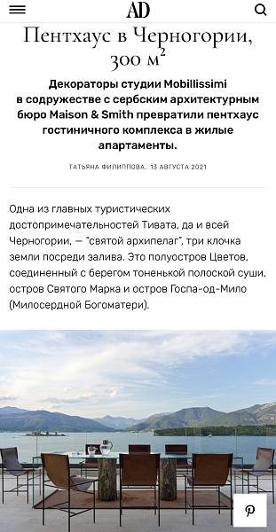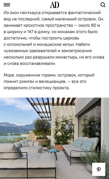 Из окон пентхауса открывается фантастический вид на последний, самый маленький островок. Он занимает крохотное пространство — около 80 м в ширину и 147 в длину, но монахам этого было достаточно, чтобы построить церковь с колокольней и монашеские кельи. Море, окруженное горами, островок, который помнит римлян и венецианцев, — все это определило стилистику проекта.