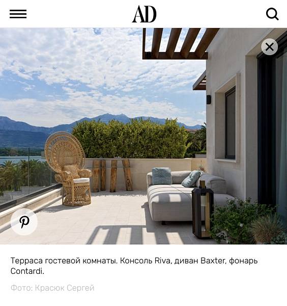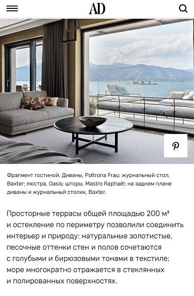 Просторные террасы общей площадью 200 м² и остекление по периметру позволили соединить интерьер и природу: натуральные золотистые, песочные оттенки стен и полов сочетаются с голубыми и бирюзовыми тонами в текстиле; море многократно отражается в стеклянных и полированных поверхностях.