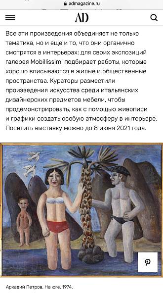 Все эти произведения объединяет не только тематика, но и еще и то, что они органично смотрятся в интерьерах: для своих экспозиций галерея Mobillissimi подбирает работы, которые хорошо вписываются в жилые и общественные пространства. Кураторы разместили произведения искусства среди итальянских дизайнерских предметов мебели, чтобы продемонстрировать, как с помощью живописи и графики создать особую атмосферу в интерьере. Посетить выставку можно до 8 июня 2021 года.