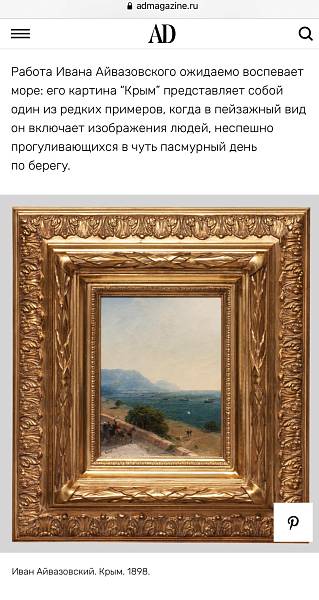 Работа Ивана Айвазовского ожидаемо воспевает море: его картина “Крым” представляет собой один из редких примеров, когда в пейзажный вид он включает изображения людей, неспешно прогуливающихся в чуть пасмурный день по берегу.