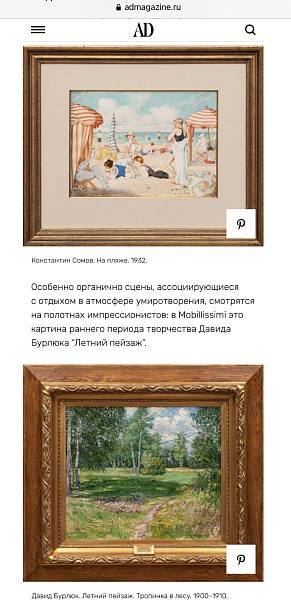Особенно органично сцены, ассоциирующиеся с отдыхом в атмосфере умиротворения, смотрятся на полотнах импрессионистов: в Mobillissimi это картина раннего периода творчества Давида Бурлюка “Летний пейзаж”.