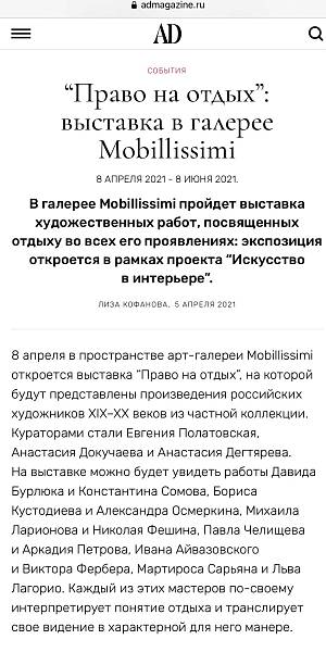 8 апреля в пространстве арт-галереи Mobillissimi откроется выставка “Право на отдых”, на которой будут представлены произведения российских художников XIX–XX веков из частной коллекции. Кураторами стали Евгения Полатовская, Анастасия Докучаева и Анастасия Дегтярева. На выставке можно будет увидеть работы Давида Бурлюка и Константина Сомова, Бориса Кустодиева и Александра Осмеркина, Михаила Ларионова и Николая Фешина, Павла Челищева и Аркадия Петрова, Ивана Айвазовского и Виктора Фербера, Мартироса Сарьяна и Льва Лагорио. Каждый из этих мастеров по-своему интерпретирует понятие отдыха и транслирует свое видение в характерной для него манере.