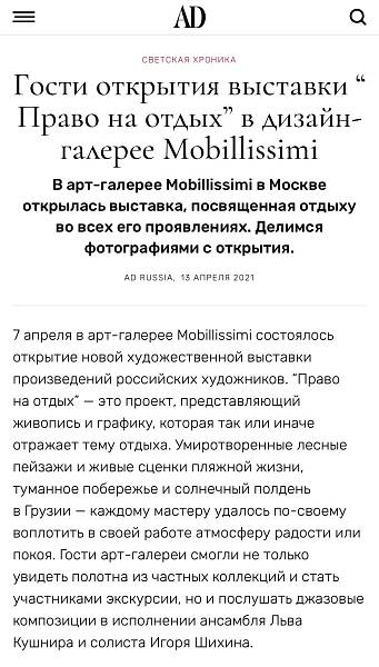 7 апреля в арт-галерее Mobillissimi состоялось открытие новой художественной выставки произведений российских художников. “Право на отдых” — это проект, представляющий живопись и графику, которая так или иначе отражает тему отдыха. Умиротворенные лесные пейзажи и живые сценки пляжной жизни, туманное побережье и солнечный полдень в Грузии — каждому мастеру удалось по-своему воплотить в своей работе атмосферу радости или покоя. Гости арт-галереи смогли не только увидеть полотна из частных коллекций и стать участниками экскурсии, но и послушать джазовые композиции в исполнении ансамбля Льва Кушнира и солиста Игоря Шихина.
