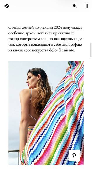 Съемка летней коллекции 2024 получилась особенно яркой: текстиль притягивает взгляд контрастом сочных насыщенных цветов, которые воплощают в себе философию итальянского искусства dolce far niente.
