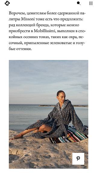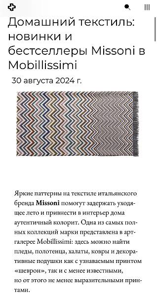 Впрочем, ценителям более сдержанной палитры Missoni тоже есть что предложить: ряд коллекций бренда, которые можно приобрести в Mobillissimi, выполнен в спокойных осенних тонах, таких как охра, песочный, припыленные зеленоватые и голубые оттенки.