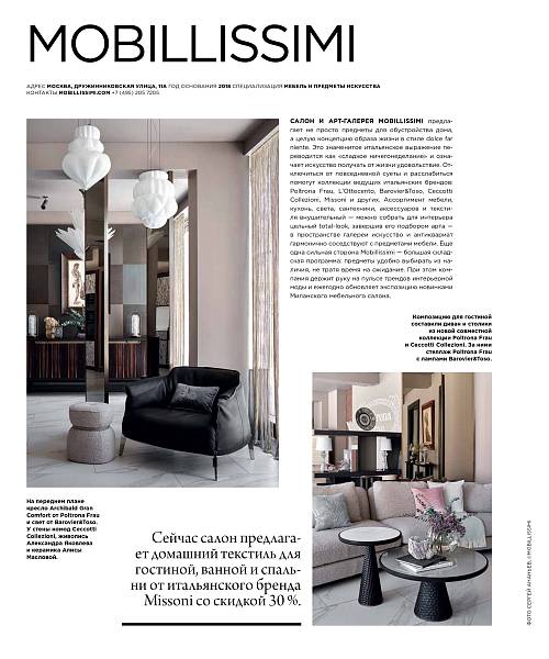 Отключиться от повседневной суеты и расслабиться помогут коллекции ведущих итальянских брендов: Poltrona Frau, L’Ottocento, Barovier&Toso, Ceccotti Collezioni, Missoni и других. Ассортимент мебели, кухонь, света, сантехники, аксессуаров и текстиля внушительный — можно собрать для интерьера цельный total-look, завершив его подбором арта — в пространстве галереи искусство и антиквариат гармонично соседствуют с предметами мебели. Еще одна сильная сторона Mobillissimi — большая складская программа: предметы удобно выбирать из наличия, не тратя время на ожидание. При этом компания держит руку на пульсе трендов интерьерной моды и ежегодно обновляет экспозицию новинками Миланского мебельного салона.