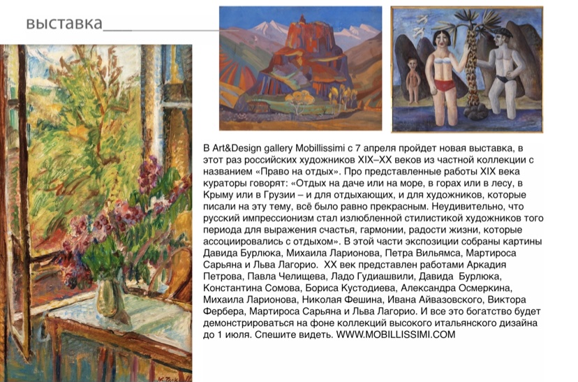 В Art&Design gallery Mobillissimi с 7 апреля пройдет новая выставка, в этот раз российских художников ХIХ—ХХ веков из частной коллекции с названием «Право на отдых». Про представленные работы ХIХ века кураторы говорят: «Отдых на даче или на море, в горах или в лесу‚ в Крыму или в Грузии - и для отдыхающих, и для художников, которые писали на эту тему, все было равно прекрасным. Неудивительно, что русский импрессионизм стал излюбленной стилистикой художников того периода для выражения счастья, гармонии, радости жизни, которые ассоциировались с отдыхом». В этой части экспозиции собраны картины Давида Бурлюка, Михаила Ларионова, Петра Вильямса, Мартироса Сарьяна и Льва Лагорио. ХХ век представлен работами Аркадия
