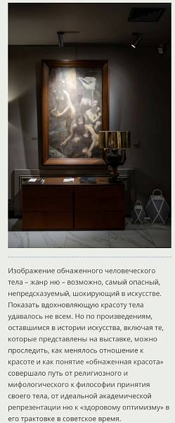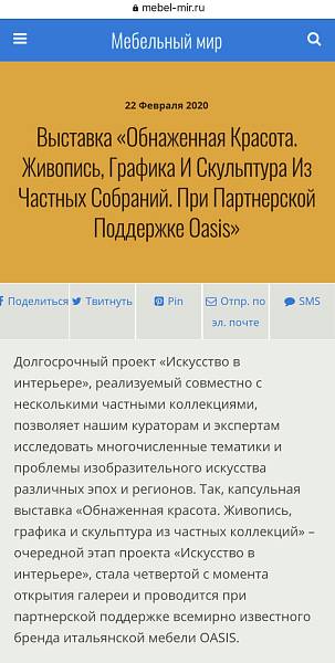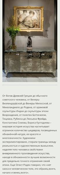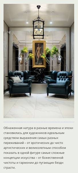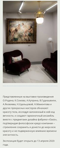 Так, капсульная выставка «Обнаженная красота. Живопись, графика и скульптура из частных коллекций» – очередной этап проекта «Искусство в интерьере», стала четвертой с момента открытия галереи и проводится при партнерской поддержке всемирно известного бренда итальянской мебели OASIS.