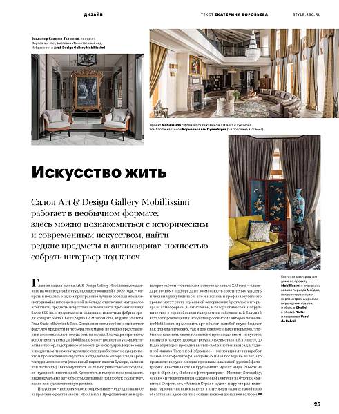 Главная задача салона Art & Design Gallery Mobillissimi, созданного на основе дизайн-студии, существовавшей с 2000 года, — собрать и показать в одном пространстве лучшие образцы итальянского дизайна (от современной мебели до отделочных материалов и текстиля), предметы искусства и антиквариата. Здесь на площади более 600 кв. м представлены коллекции известных фабрик, среди которых Salda, Chelini, Sigma L2, MissoniHome, Rugiano, Poltrona Frau, Oasis и Barovier & Toso. Сегодня клиенты особенно оценят тот факт, что предметы интерьера этих марок не только представлены в экспозиции, но и всегда есть на складе. Благодаря огромному ассортименту команда Mobillissimi может полностью укомплектовать интерьер, подобрав все от мебели до аксессуаров. Редкие вещи и предметы антиквариата для проектов приобретают на аукционах: это и произведения искусства, и отделочные материалы, и архитектурные элементы (старинный паркет, панели буазери, камины или лестницы). Они могут стать не только уникальной находкой, но и удачной инвестицией. Кроме того, в галерее можно заказать индивидуальные арт-объекты, сделанные под проект: скульптуру, панно или художественную роспись.