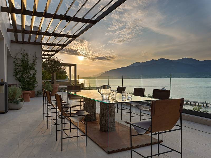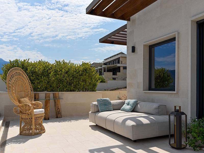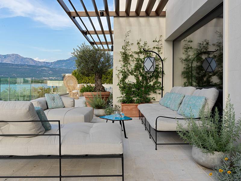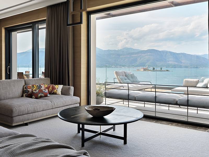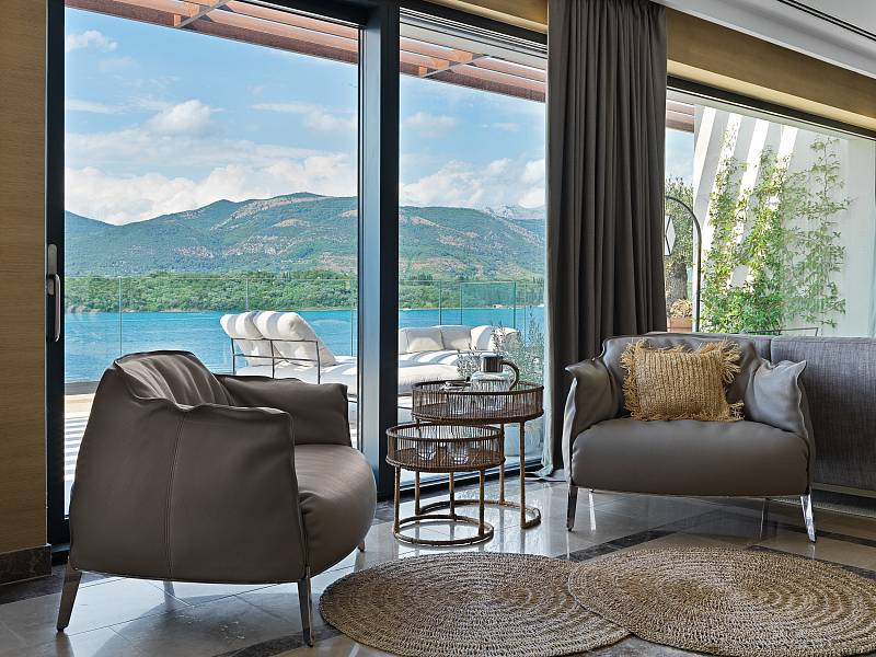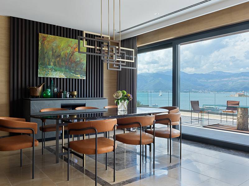 Просторные террасы общей площадью 200 м² и остекление по периметру позволили соединить интерьер и природу: натуральные золотистые, песочные оттенки стен и полов сочетаются с голубыми и бирюзовыми тонами в текстиле; море многократно отражается в стеклянных и полированных поверхностях.